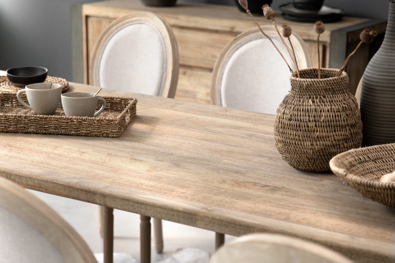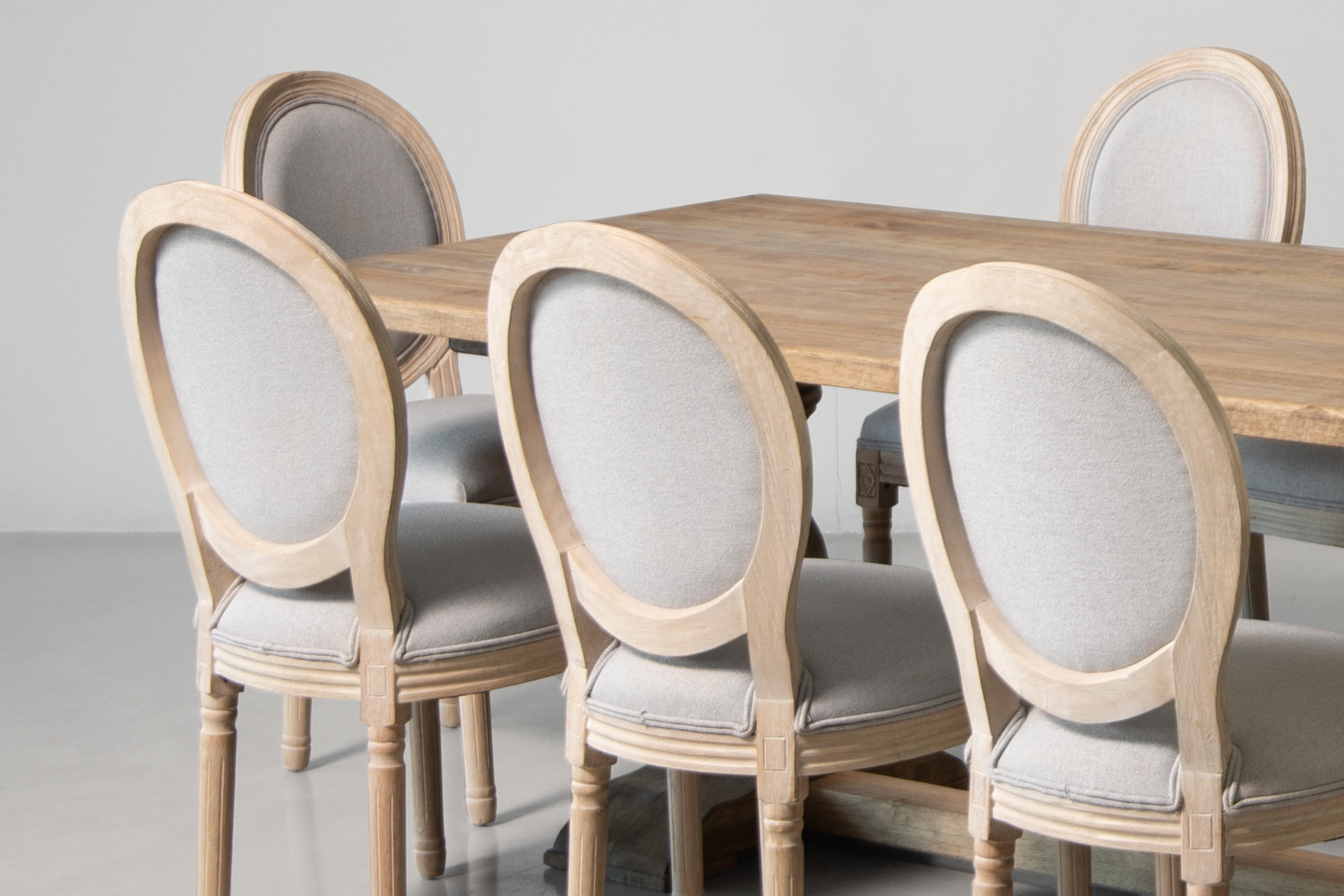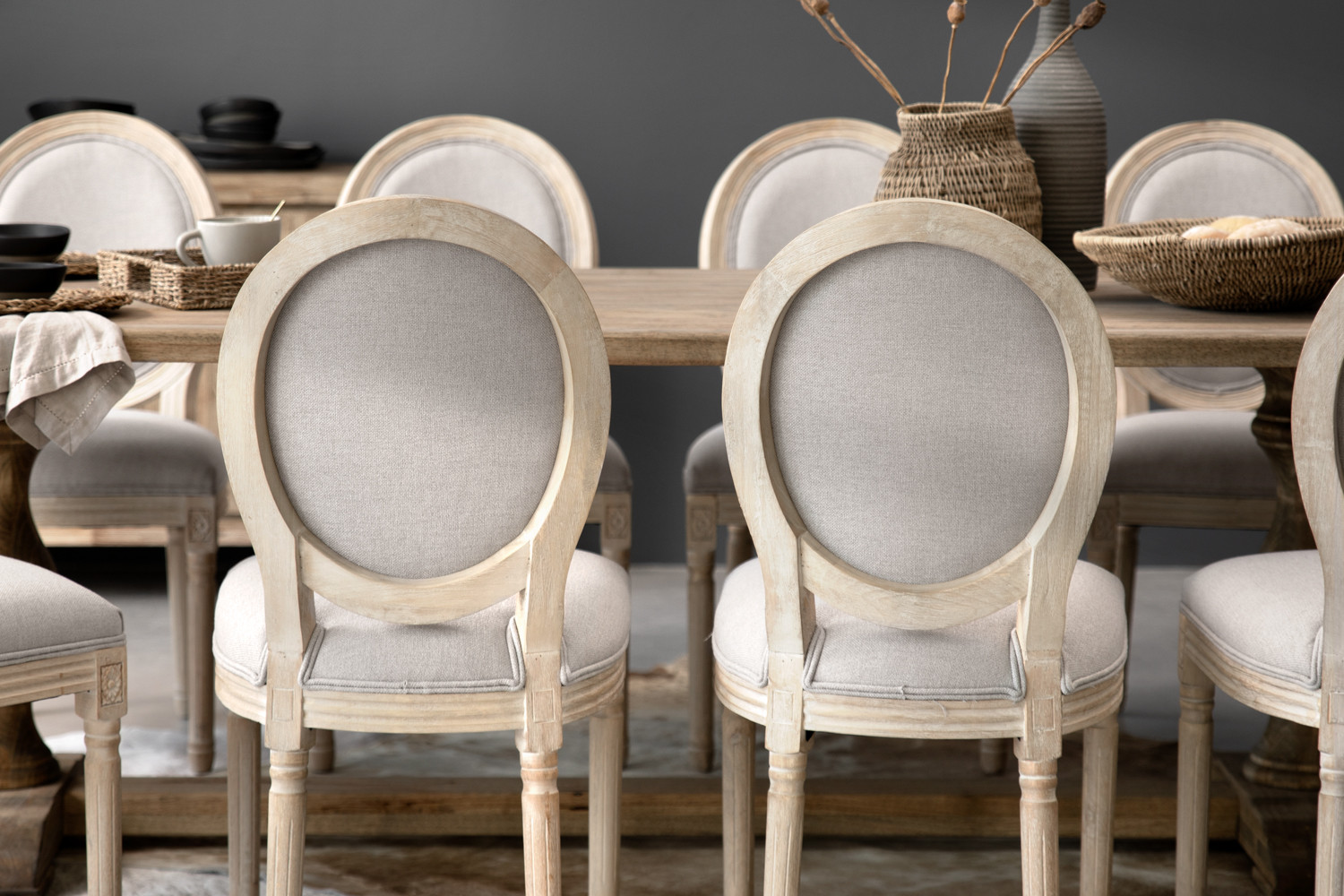 This charming combination features both table and chair crafted from Rubberwood. Rubberwood is a sustainable versatile wood known for its durability. The strength of this ultra-environmentally friendly wood means cleaning is a breeze. While the Bordeaux Dining Table features a simple finish, which brings out the unique grain of this wood and produces a slightly weathered look, the Olivia Dining Chairs sport a brushed lime wash finish and understated neutral colour palette to add a more relaxed countryside feel.
