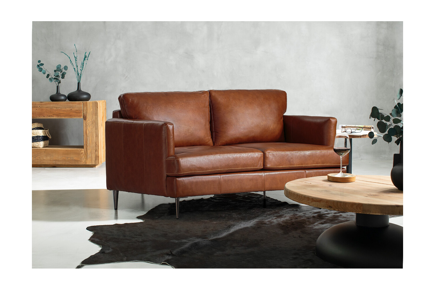 The Remington 2-Seater Leather Couch presents a modern design with an airy presence. Its slim borders and straight lines create a stylish silhouette. Upholstered in full grain leather with mild steel legs and exposed stitching, this couch displays attention to detail.