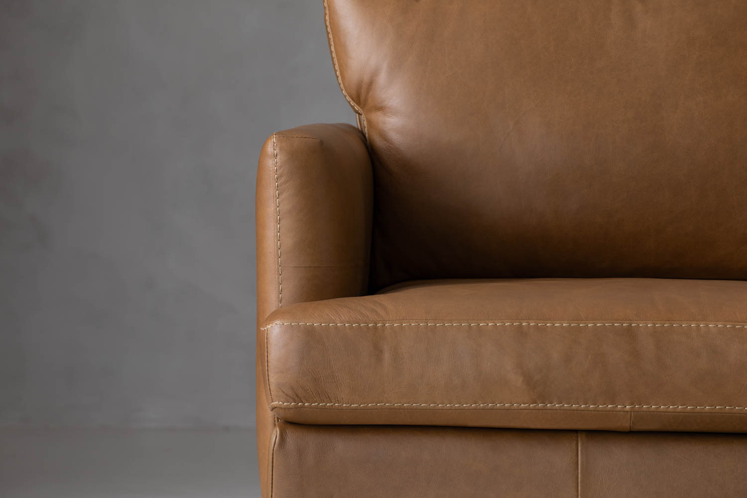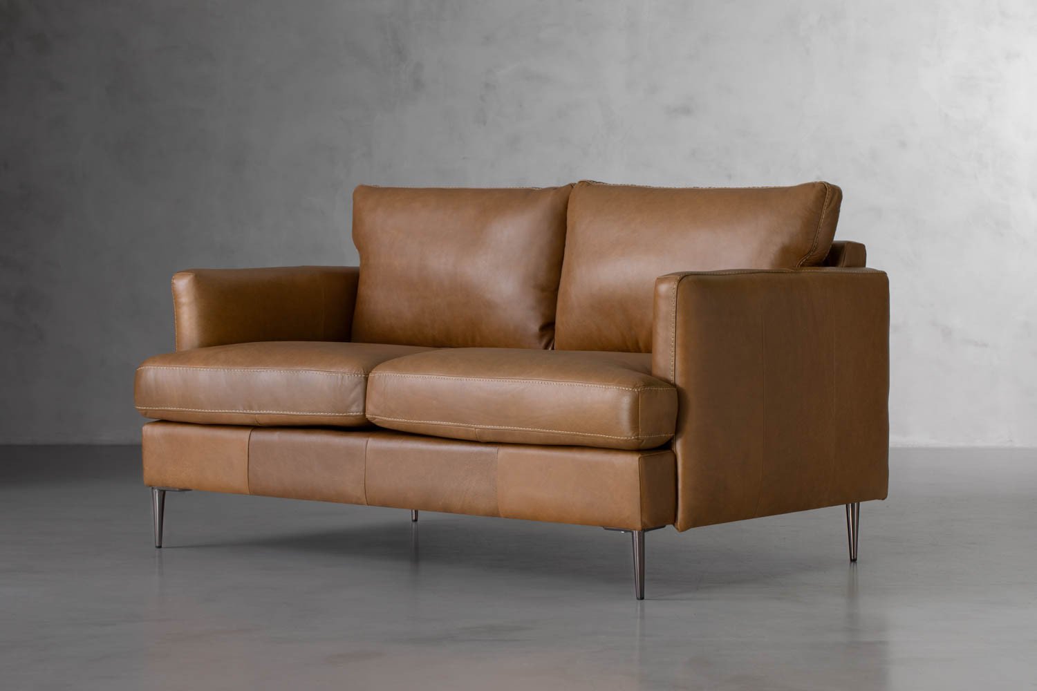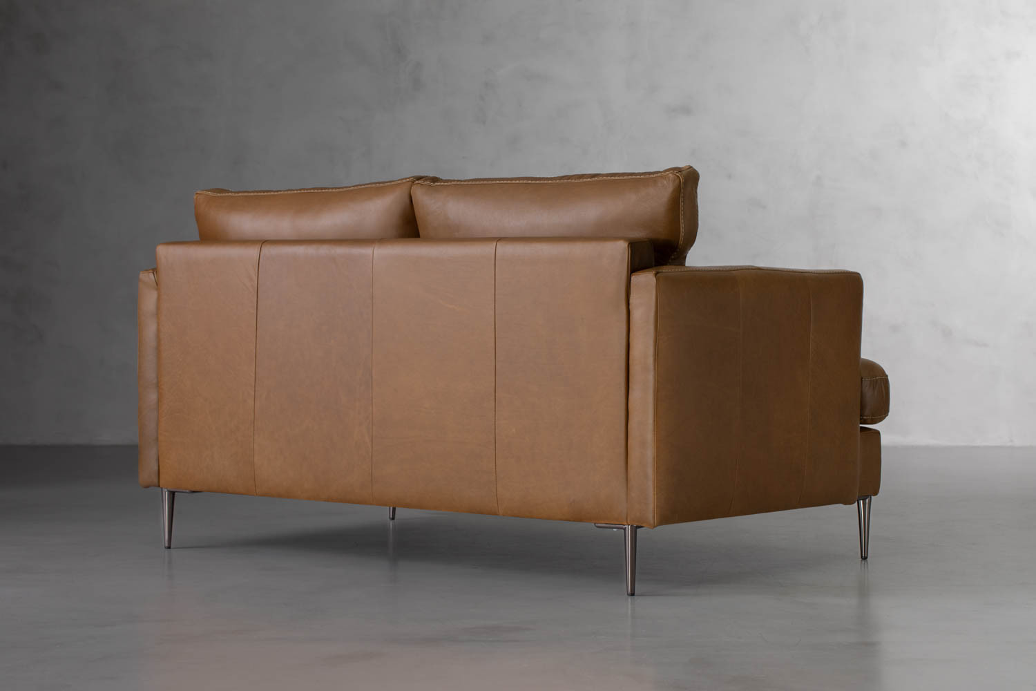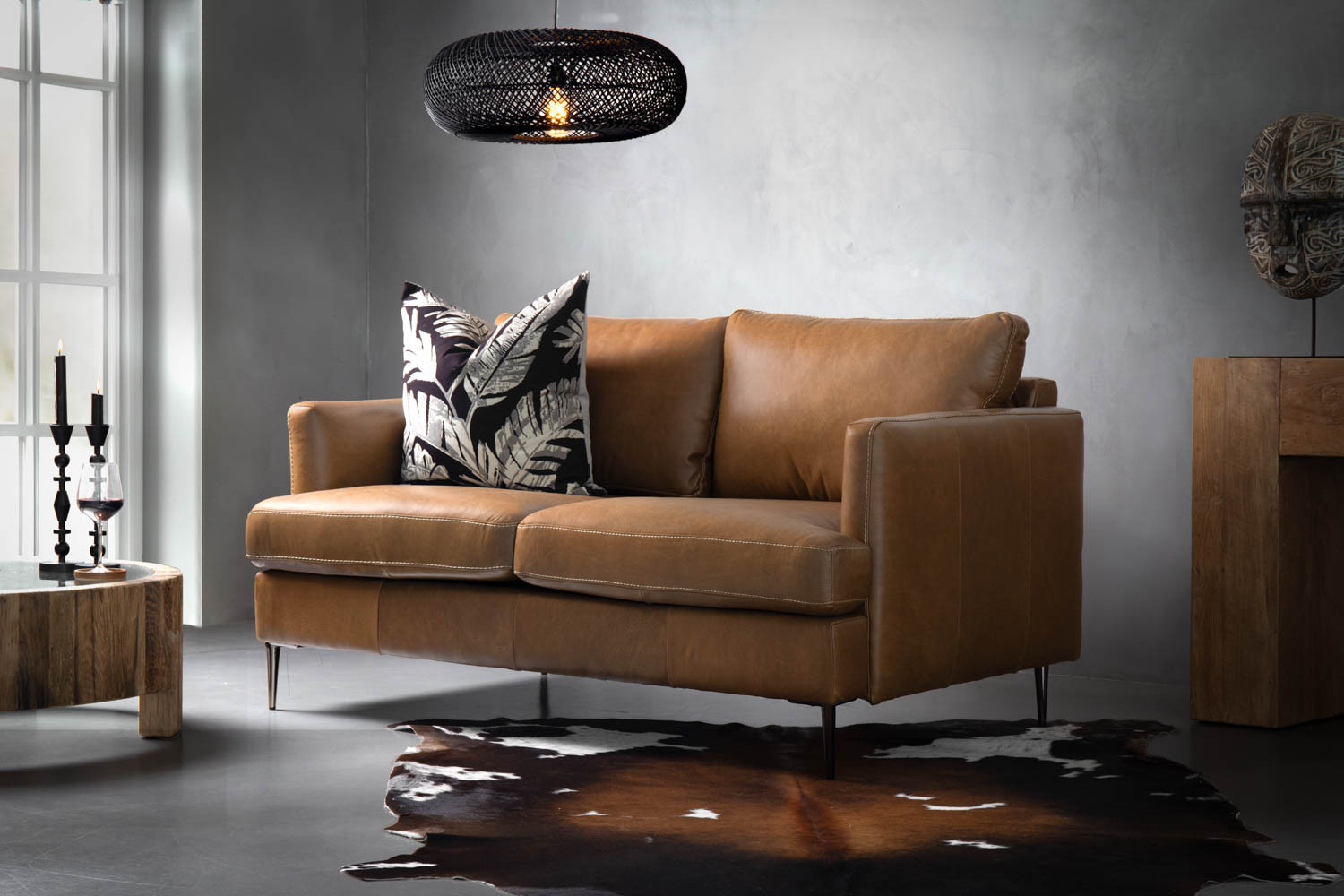 The Remington 2-Seater Leather Couch presents a modern design with an airy presence. Its slim borders and straight lines create a stylish silhouette. Upholstered in full grain leather with mild steel legs and exposed contrast stitching, this couch displays attention to detail.