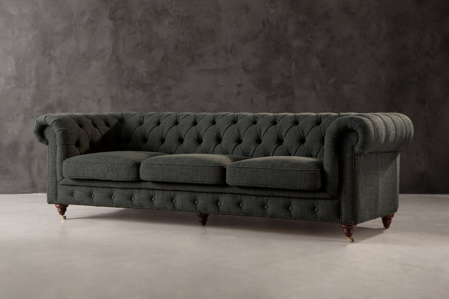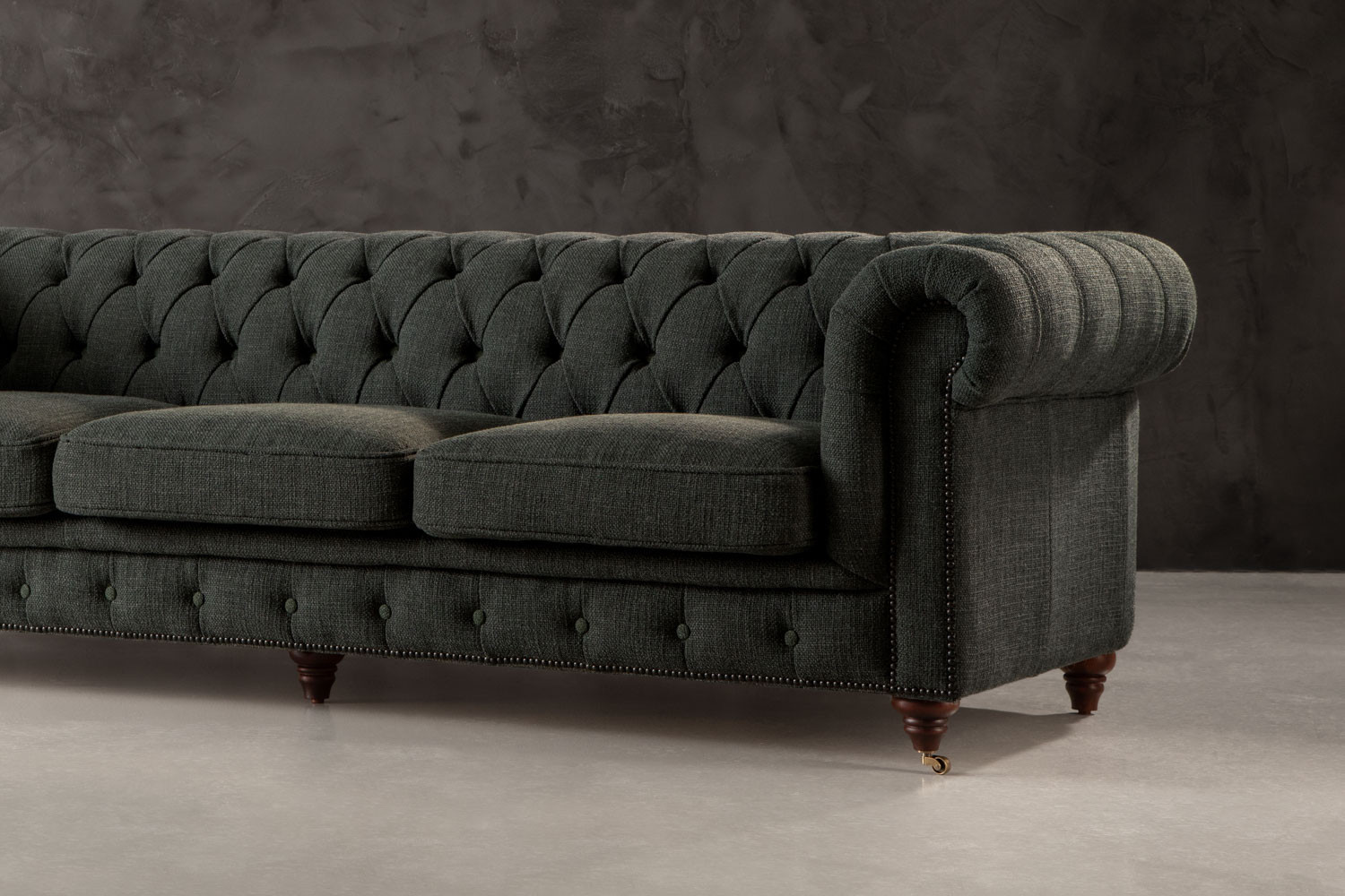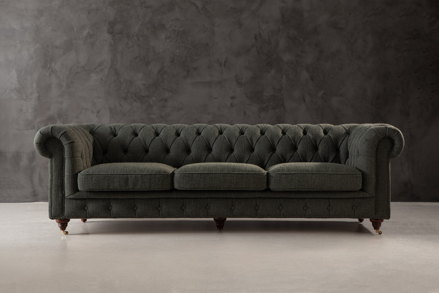 The iconic Jefferson Chesterfield 3-Seater Couch will command any room with effortless charm. With its distinct deep button tufting, high rolled arms and nail head trim, the design has proven itself as a timeless classic over the years. It lives up to its reputation, ensuring the feel of suave luxury with its textured deep-green upholstery and piano caster front feet.
