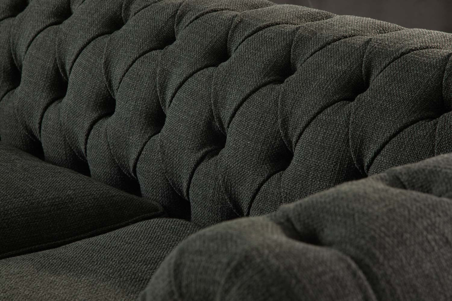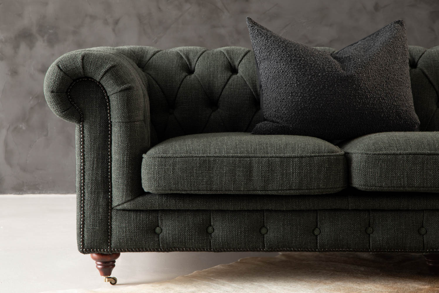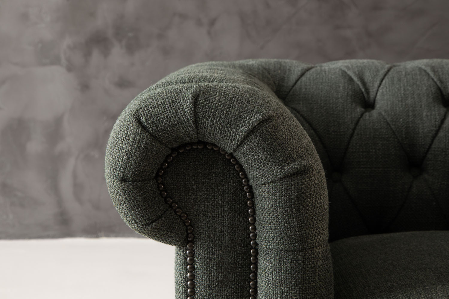 The iconic Jefferson Chesterfield 3-Seater Couch will command any room with effortless charm. With its distinct deep button tufting, high rolled arms and nail head trim, the design has proven itself as a timeless classic over the years. It lives up to its reputation, ensuring the feel of suave luxury with its textured deep-green upholstery and piano caster front feet.