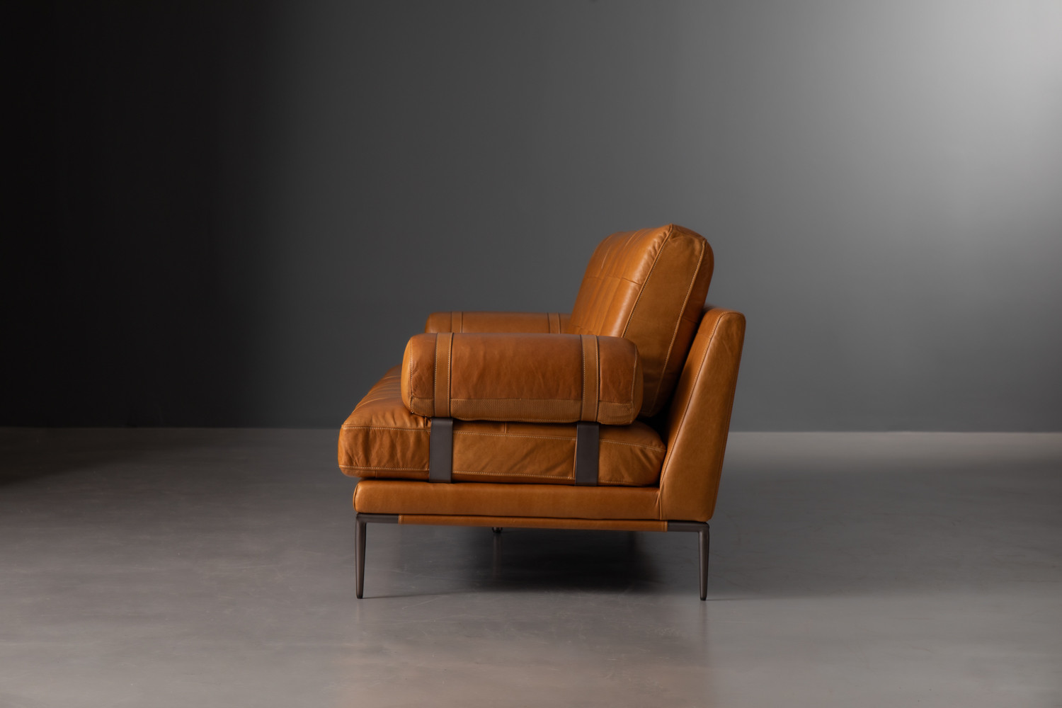 The full-grain leather used in the Fletcher ensures durability, making this couch a long-lasting investment for your home. It's supported by a solid wooden frame and metal legs, giving it a sturdy foundation without compromising on its sleek design. Whether placed in a minimalist setting or a more decorative space, this 3-seater is designed to be a focal point in any living room.