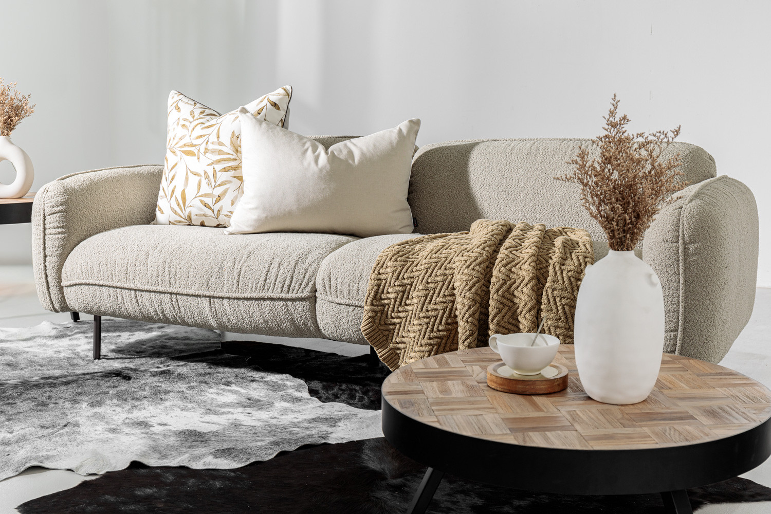 The Gabriel’s beautifully rounded armrests and cushioned seating make it the perfect blend of style and functionality. This couch seamlessly integrates into both contemporary and classic interiors. Its timeless design, combined with the durability of the boucle fabric, ensures that the Gabriel will remain a centrepiece of comfort and style in your home for years to come.