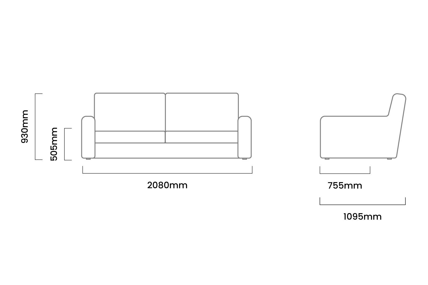 2080mm (L) x 1095mm (W) x 930mm (H) | Seat Height - 505mm | Seat Depth - 755mm