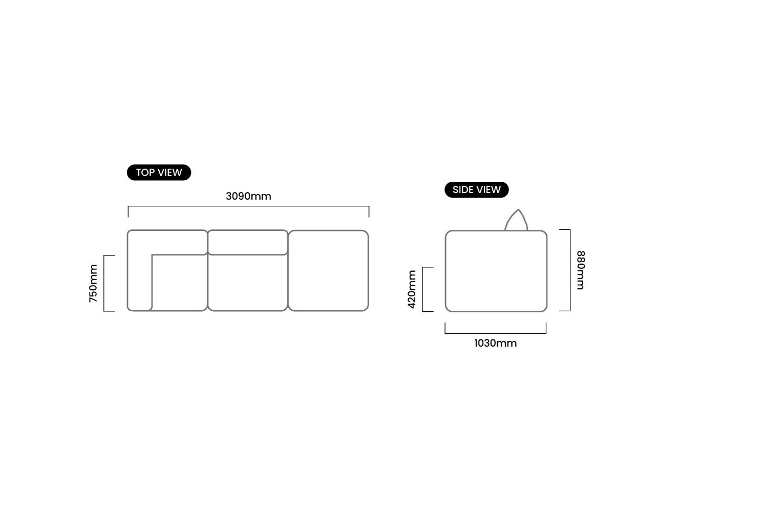 3090mm (L) x 1030mm (W) x 880mm (H) | Seat Height 420mm | Seat Depth 750mm
