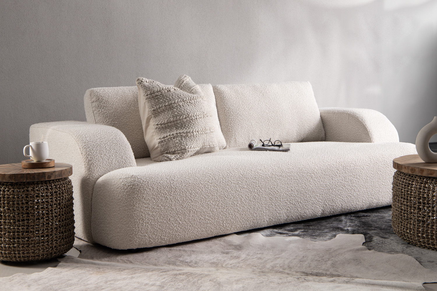 The Orclan 3-Seater Couch is where graceful design meets luxurious comfort. Wrapped in plush boucle fabric, it boasts stylish and inviting proportions that make it a perfect fit for any contemporary living space. With gentle curves and generously sized cushions, this couch promises hours of relaxation for you and your loved ones.