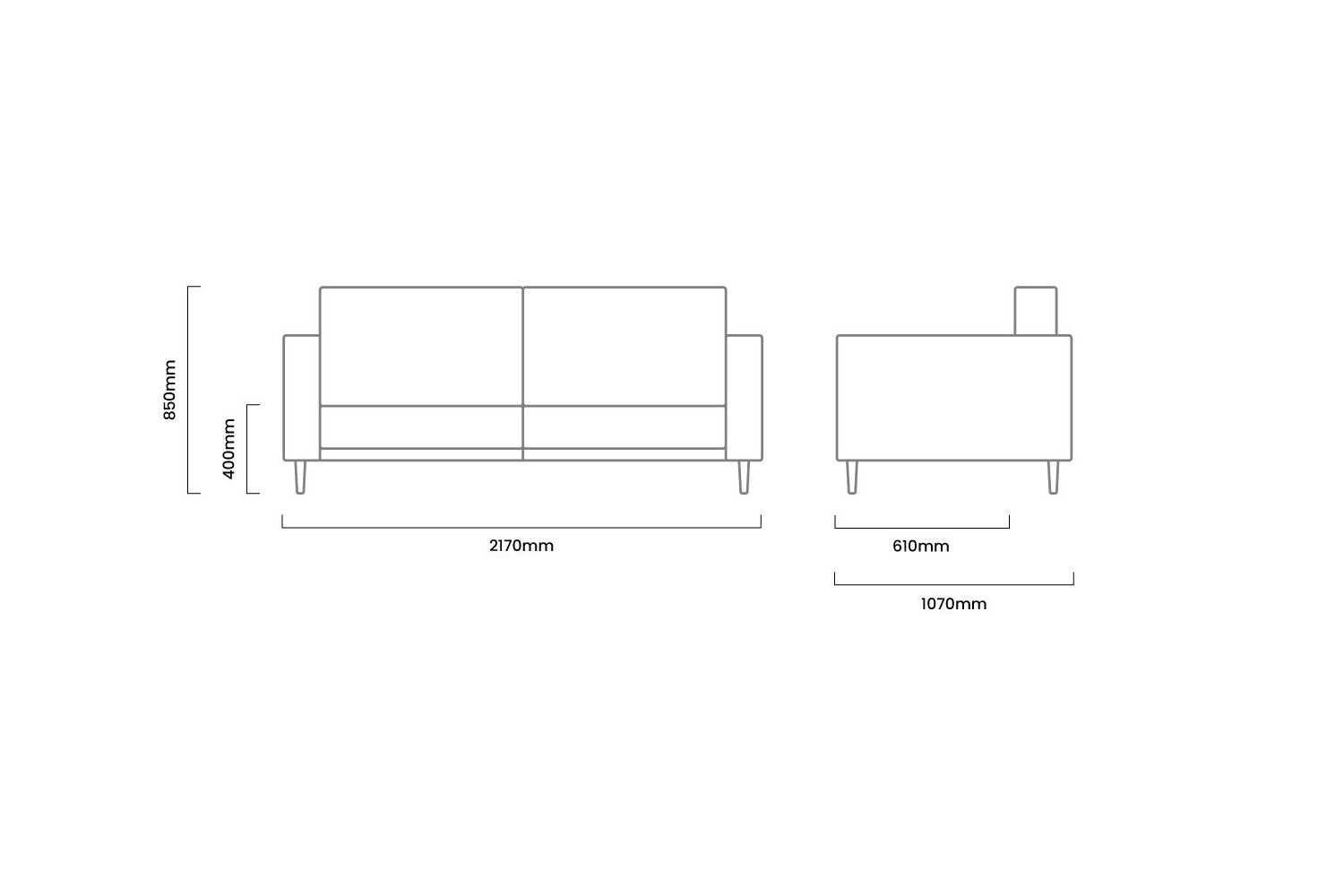 2170mm (L) x 1070mm (W) x 850mm (H) | Seat Height - 400mm | Seat Depth -610mm