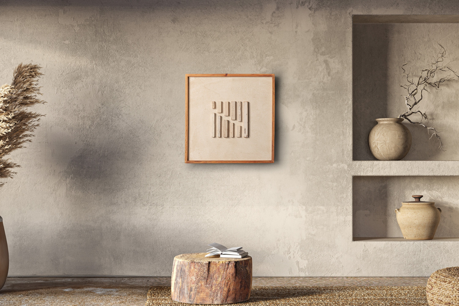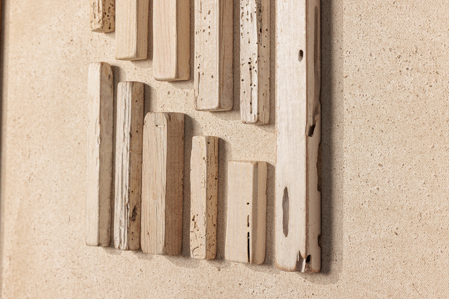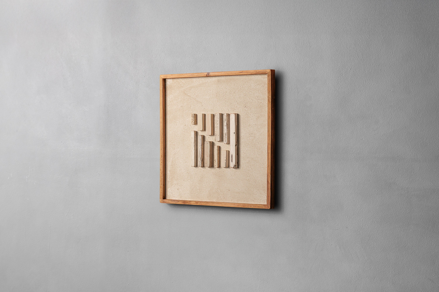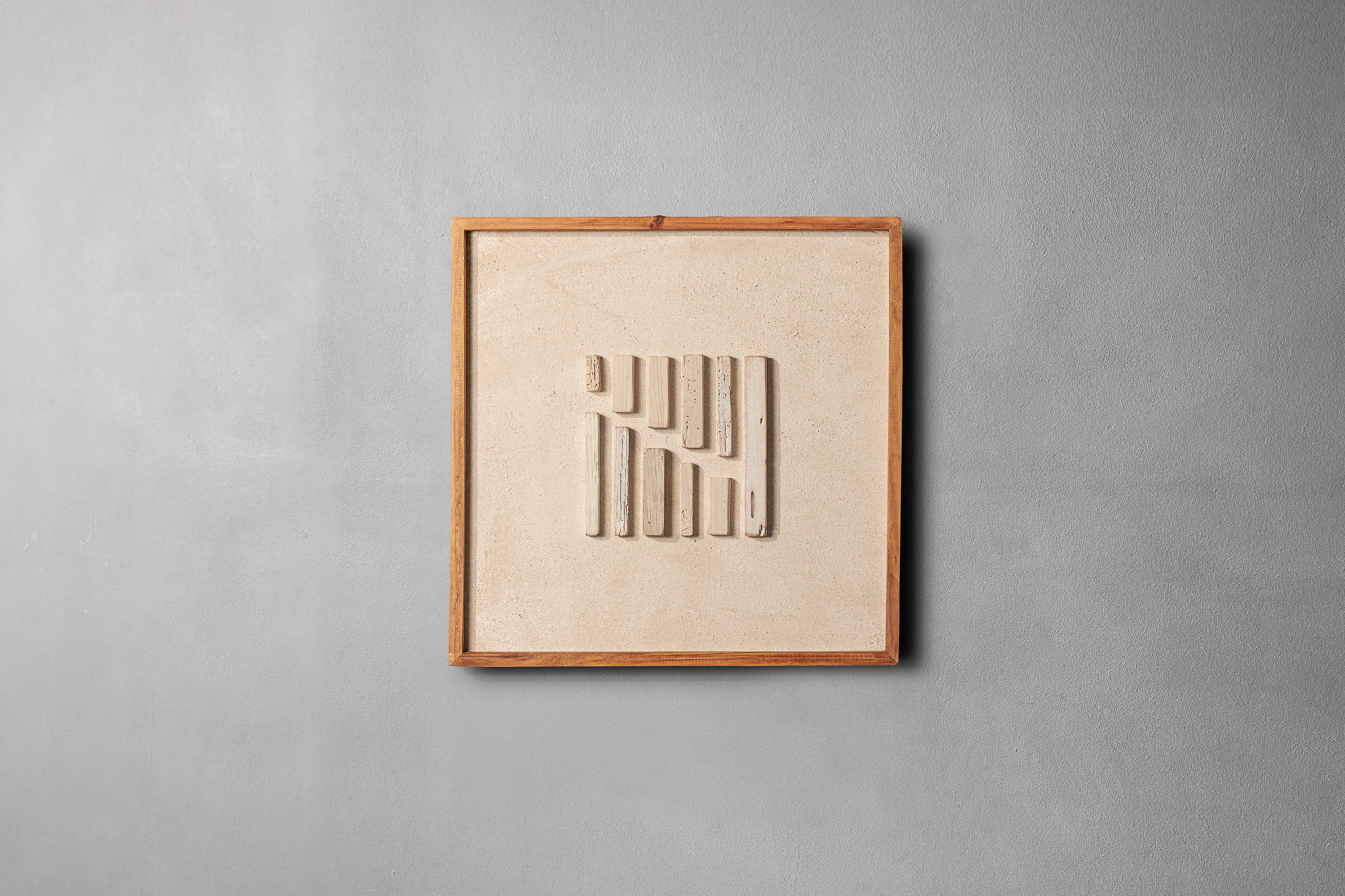 The Kalina captures subtle charm and organic beauty within a frame. Featuring an asymmetrical arrangement of textured wood, its thought-provoking pattern is set against the soft tones of its natural backdrop. It’s a piece that brings a sense of calm and sophistication to any space.