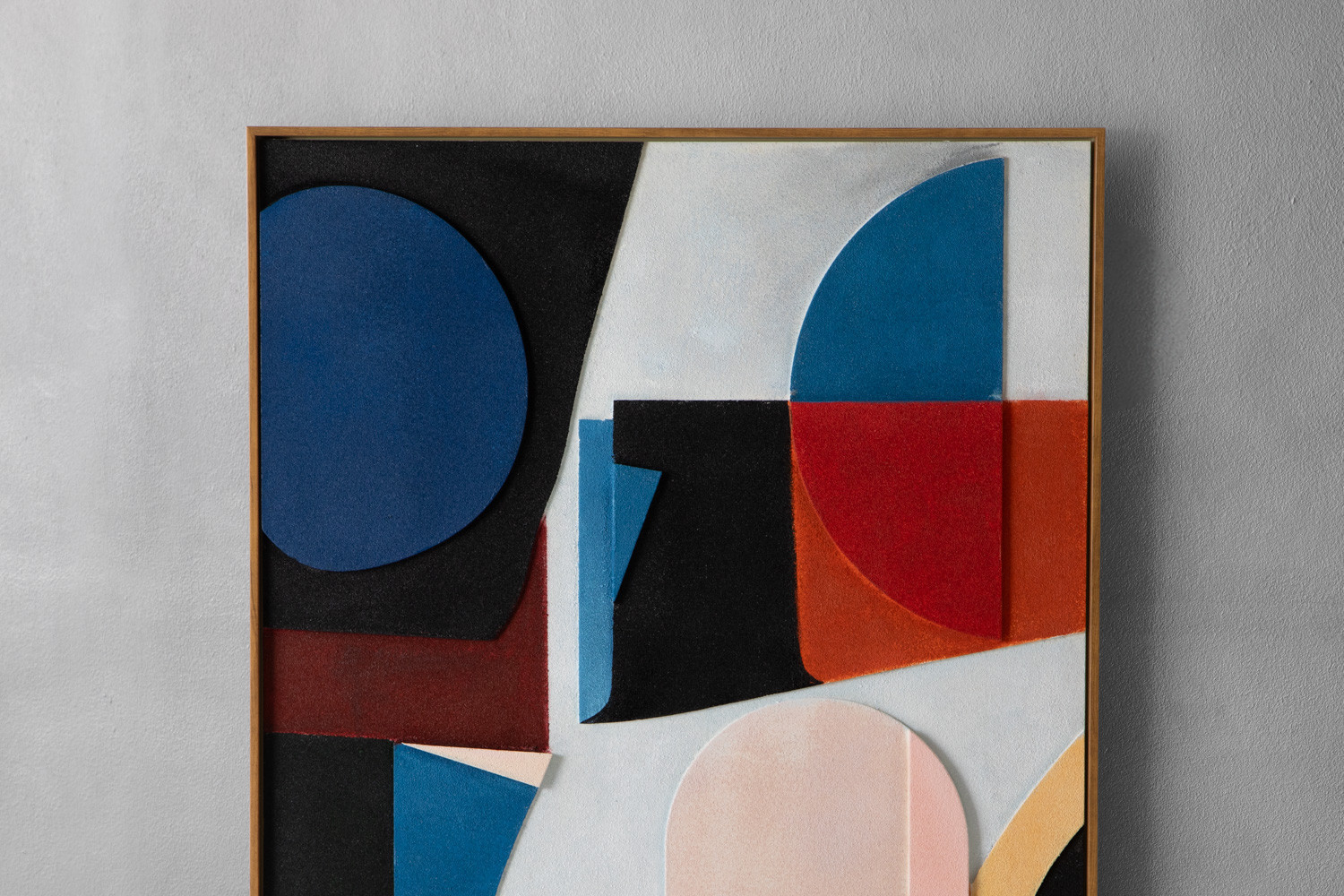 Make a style statement with the Tezara Wall Art. This refined abstract plays with an array of shapes in charcoal, deep blue, and blush pink. The richly layered composition offers a tactile, sculptural feel, while the palette blends effortlessly with natural woods, neutrals, and matte black accents. It’s designed to elevate living rooms, bedrooms, home offices, and stylish apartments.