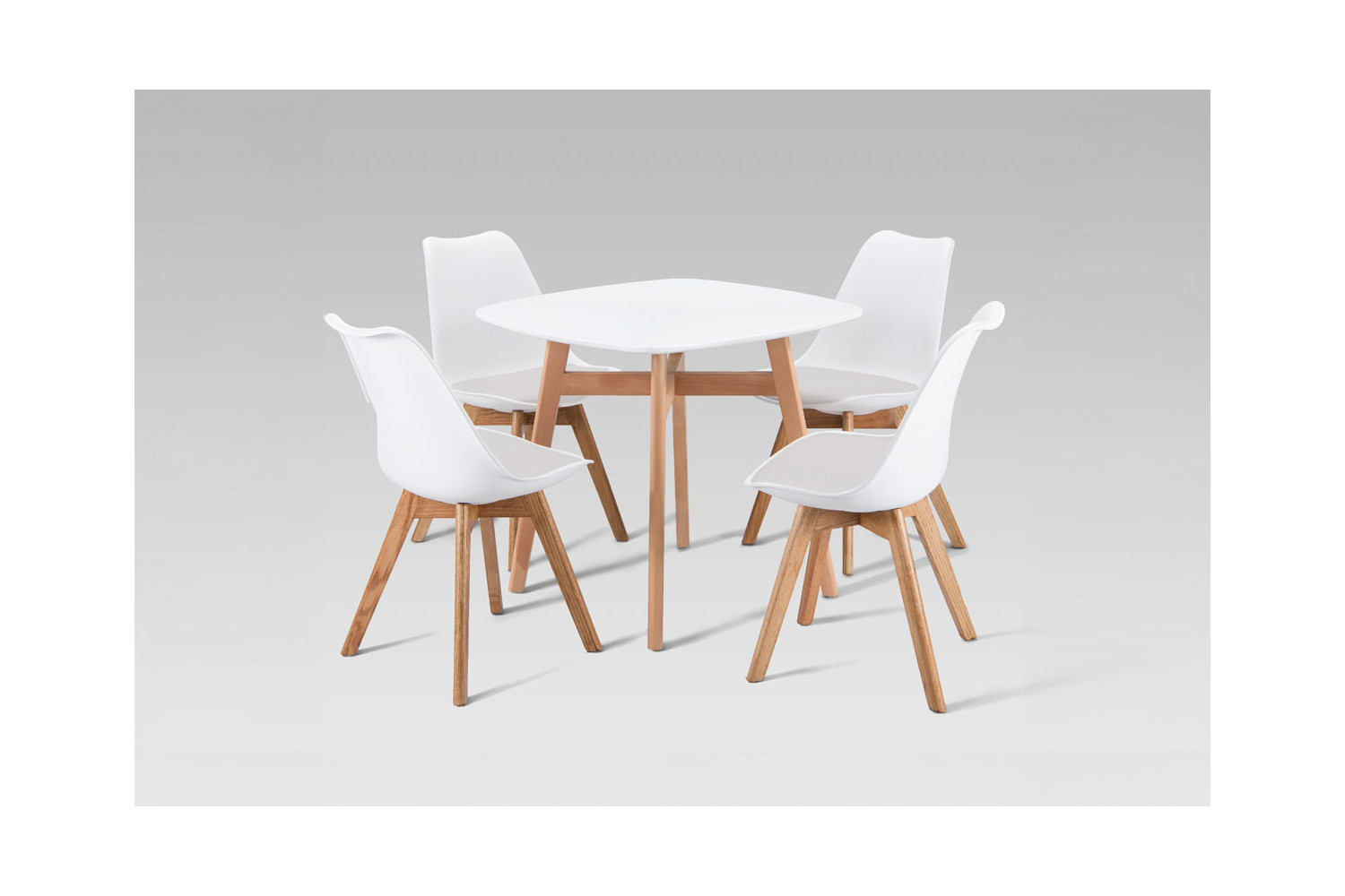 Constructed with a durable MDF top and solid beech-wood legs, the Louis dining table is sturdy, streamlined, and easy to clean and care for. The simple yet well-balanced design of the Cody dining chair features a padded polycarbonate seat for hours of dining comfort, with oak legs adding a warm and inspired contrast with excellent durability.