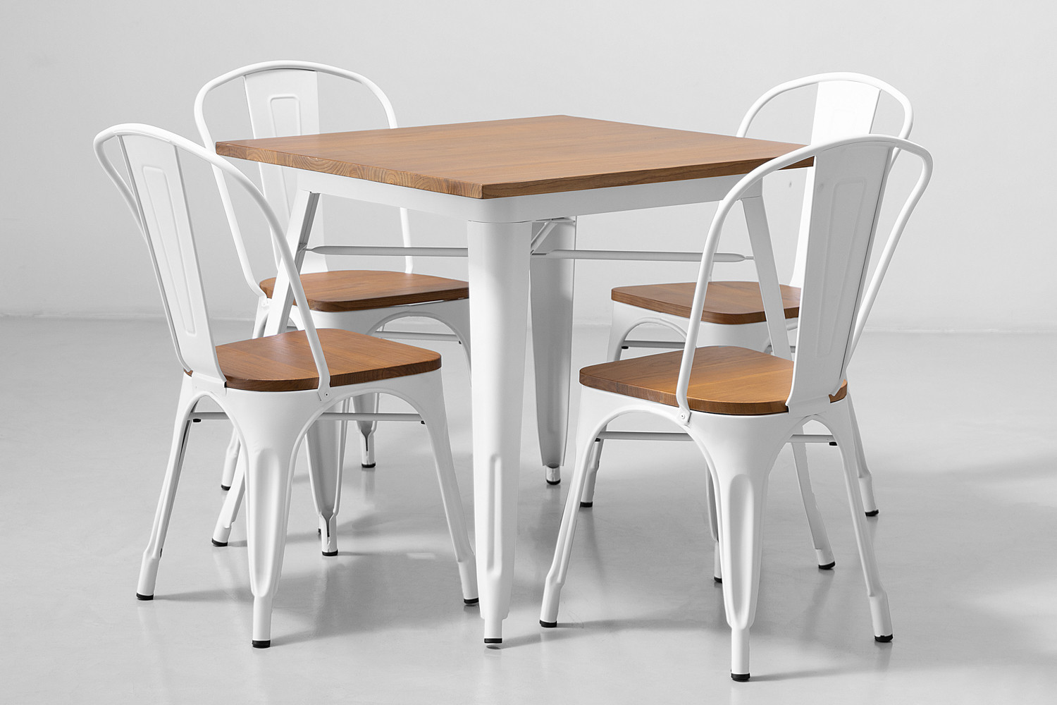 This café-style dining set with its sleek framing and detailed wooden tops creates a relaxed feel thanks to its understated neutral colour palette.
