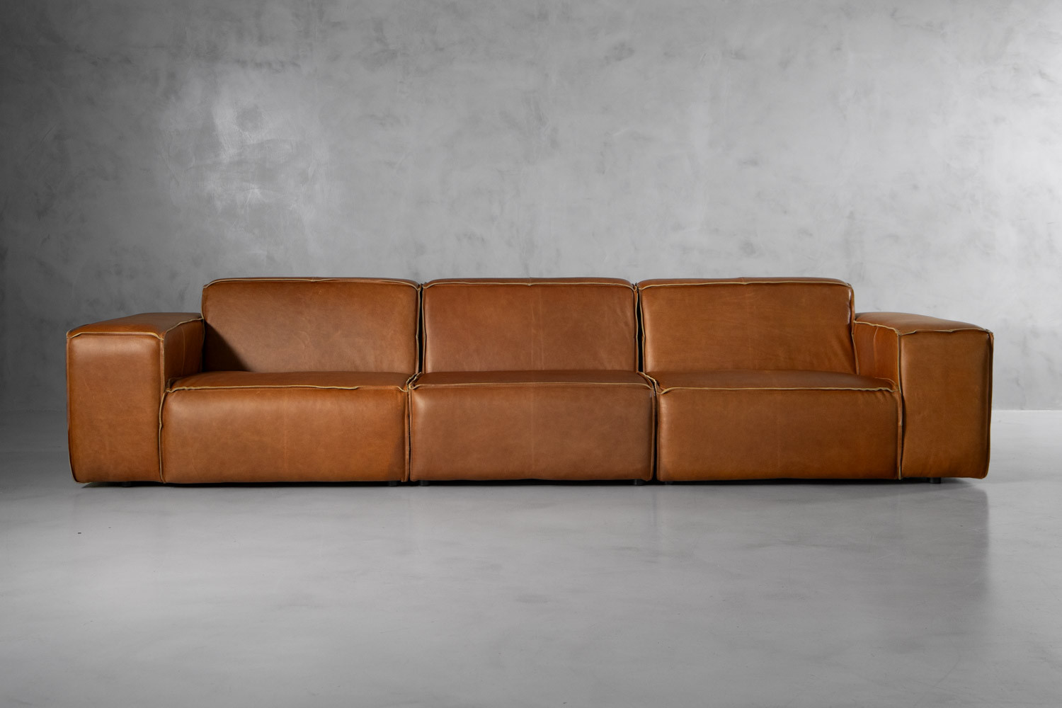 This Jagger Modular Couch boasts ample seating and functionality moving together to create a 4-seater couch or breaking up into multiple seating configurations. The Jagger presents a stylish homesteading staple with a raw, untainted look. This is achieved by pairing the iconic reversed seam stitching with genuine leather, durable yet soft-to-the-touch.