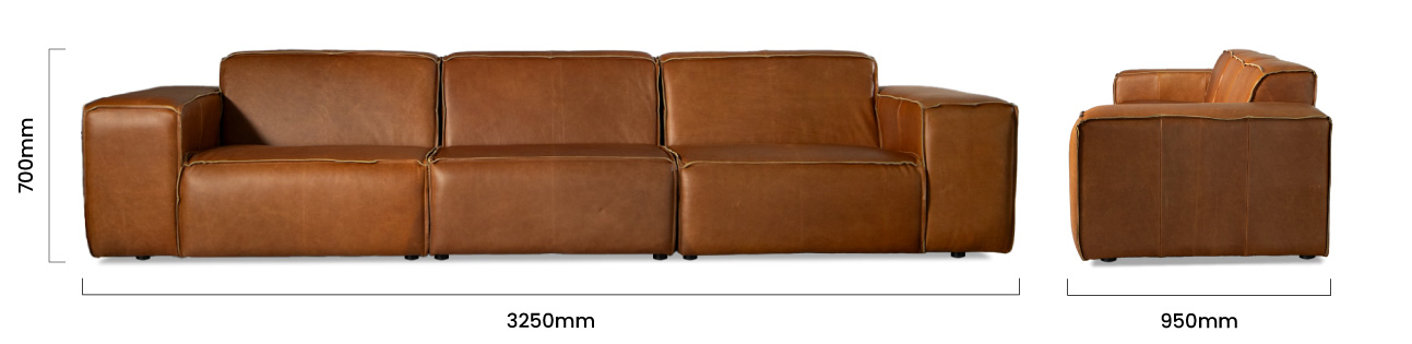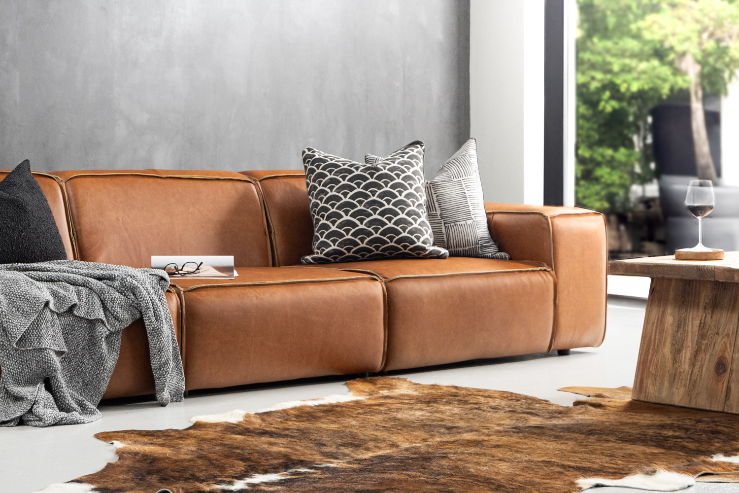 The Jagger Leather Modular 4-Seater Couch boasts a bold contemporary design with a square-like silhouette, keeping the design simple but striking. With plenty of style and space, this modular couch is upholstered with genuine full grain leather, finished with reversed stitched seams to keep a natural raw look with a warm feel.