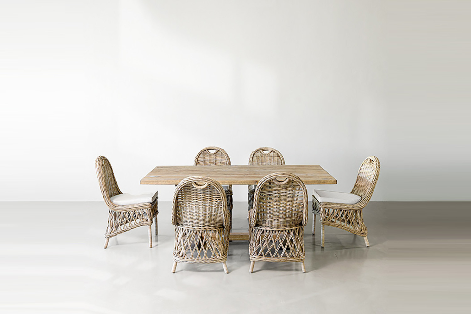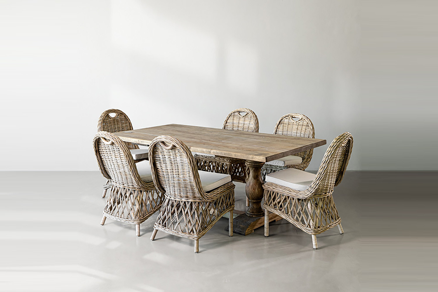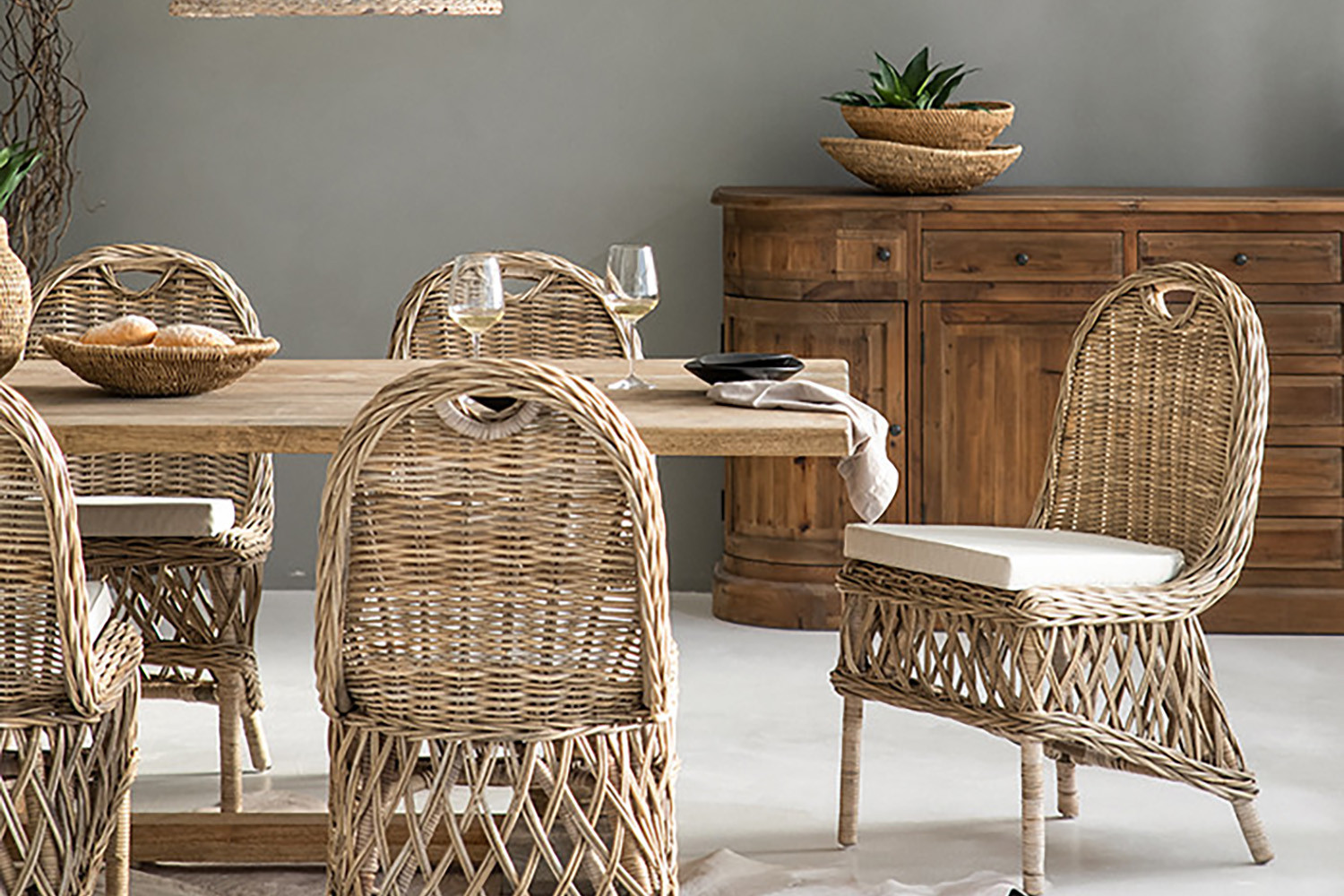 This dining set pairs a solid wood table with cane and rattan chairs, which introduces a natural and warm feel to your dining experience. This tranquil dining experience is not only sustainable and durable but a stylistic choice that will impress your dinner guests.
