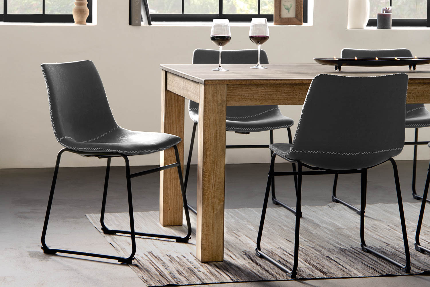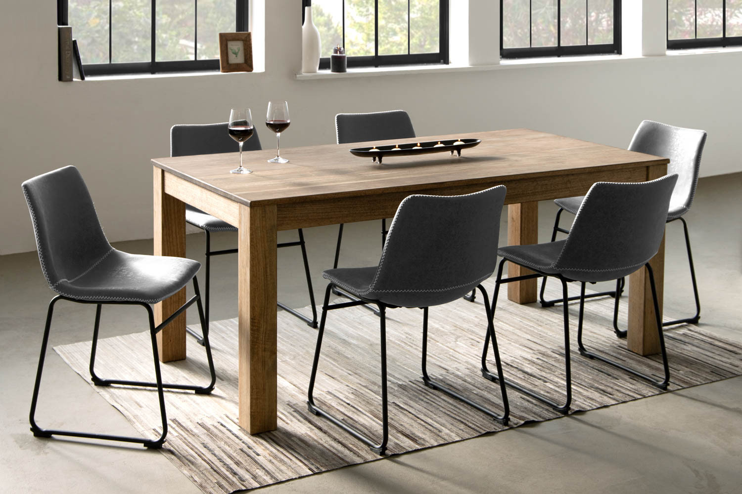 This contemporary look dining set means that you and your family can enjoy a versatile, comfortable, and yet aesthetically pleasing dining experience. The stylish chairs are available in storm grey, ginger, camel and ebony.