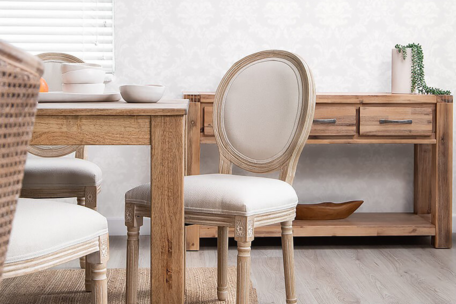 This charming combination features both table and chair crafted from rubberwood. Rubberwood is a sustainable versatile wood known for its durability. The strength of this ultra-environmentally friendly wood means cleaning is a breeze and is easily done with soap, water and a good drying. While the Montreal Dining Table features a simple finish, which brings out the unique grain of this wood and produces a slightly weathered look the Olivia Dining Chairs sport a brushed lime wash finish and understated neutral colour palette to add a more relaxed countryside feel.