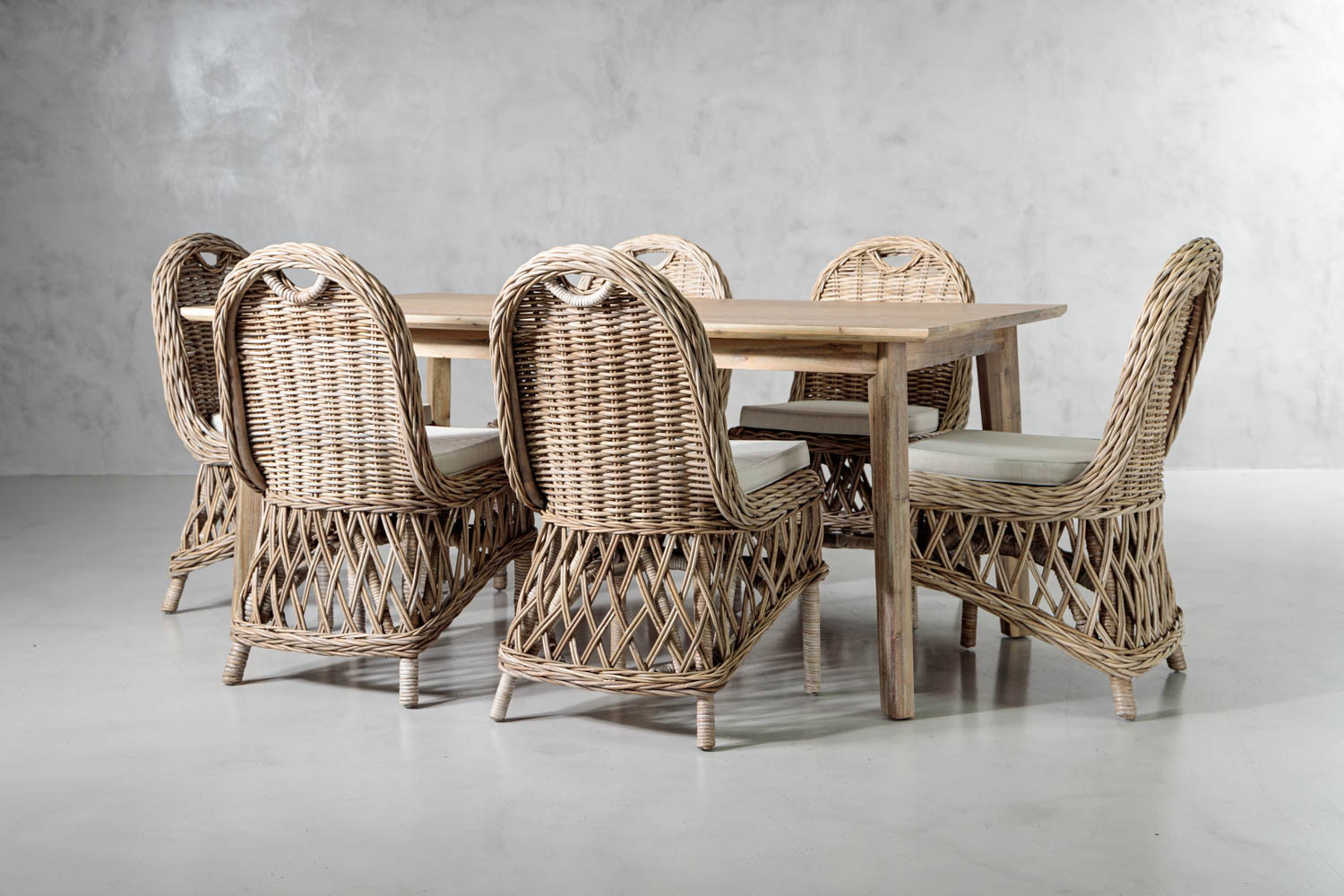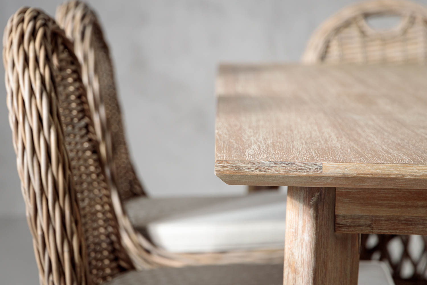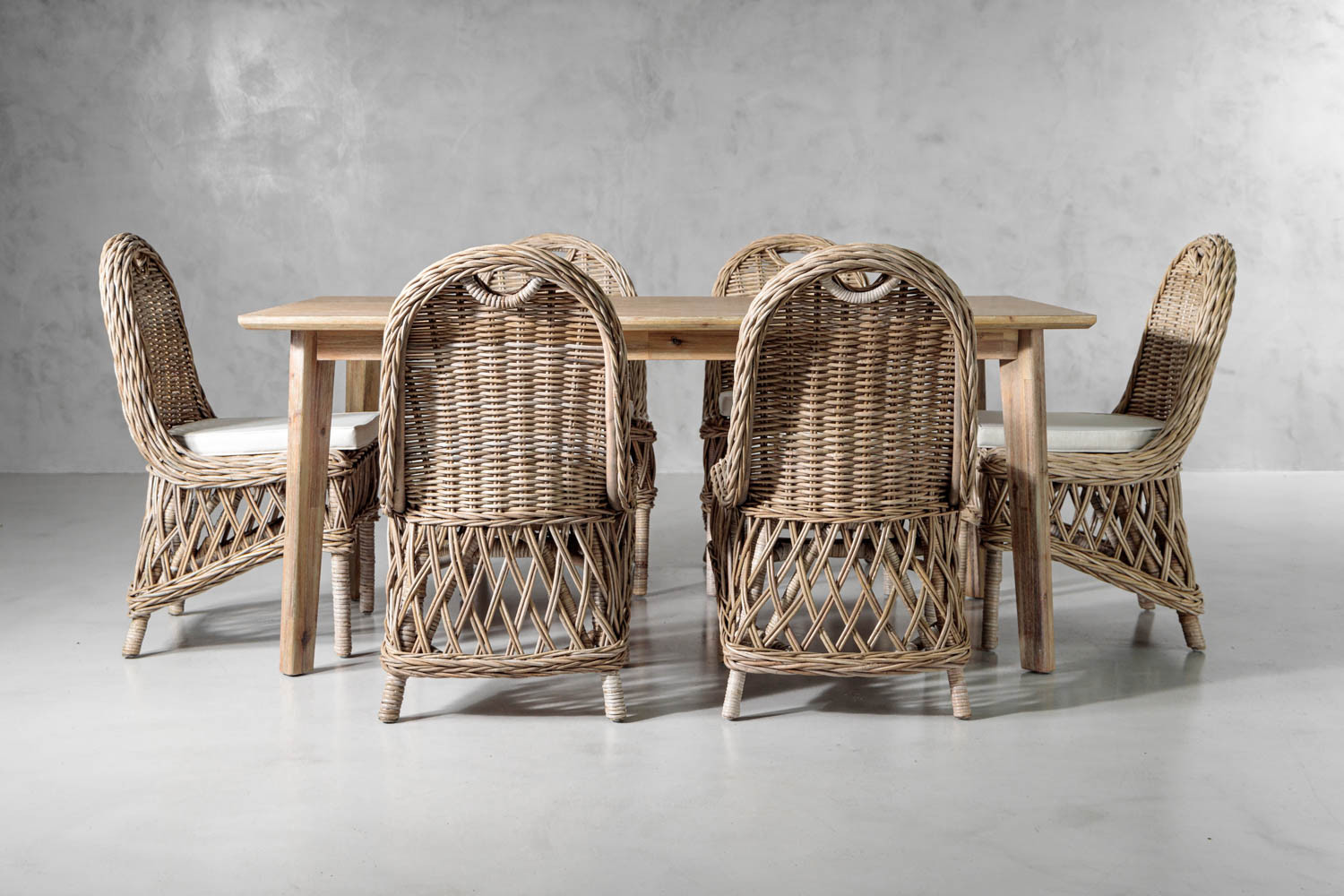 The epitome of timeless elegance: the Stanford Dining Table and Avilen Dining Chair set. Crafted to perfection, this dining ensemble effortlessly combines sophistication and comfort, making every meal a cherished affair. The Stanford Dining Table boasts a sleek wood design that exudes warmth, while the Avilen Dining Chairs provide plush seating with a touch of refined charm from its natural rattan design.