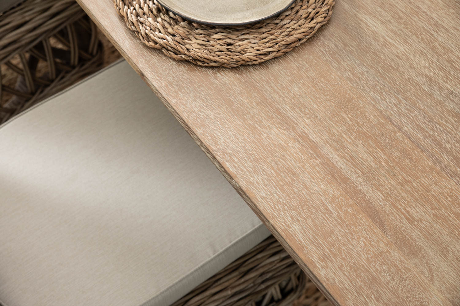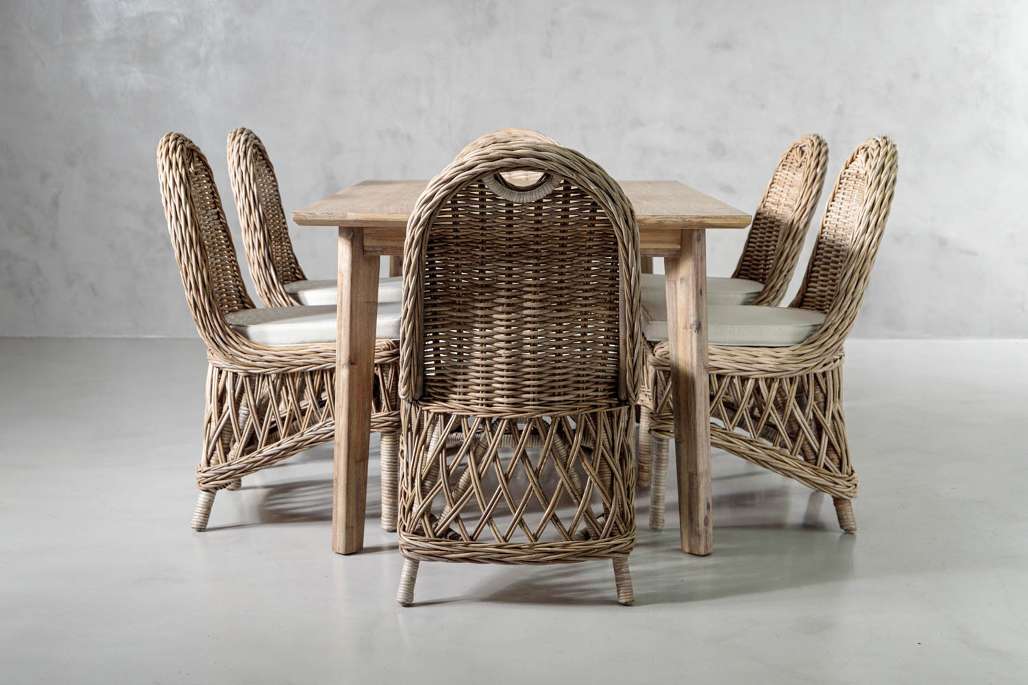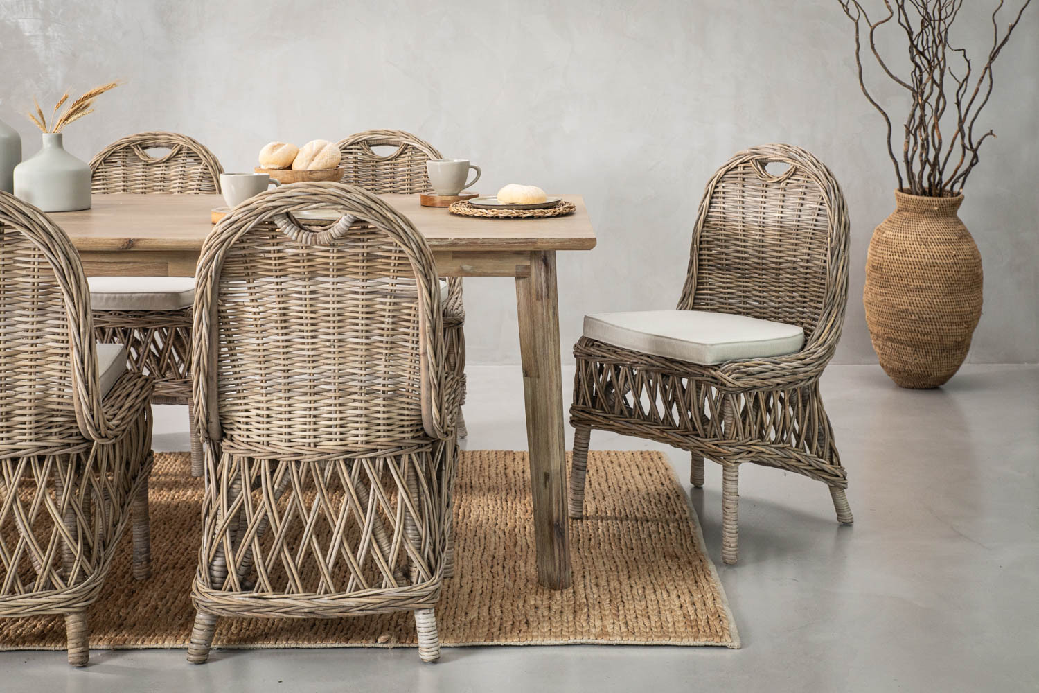 The epitome of timeless elegance: the Stanford Dining Table and Avilen Dining Chair set. Crafted to perfection, this dining ensemble effortlessly combines sophistication and comfort, making every meal a cherished affair. The Stanford Dining Table boasts a sleek wood design that exudes warmth, while the Avilen Dining Chairs provide plush seating with a touch of refined charm from its natural rattan design.