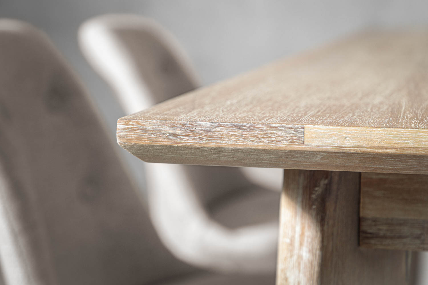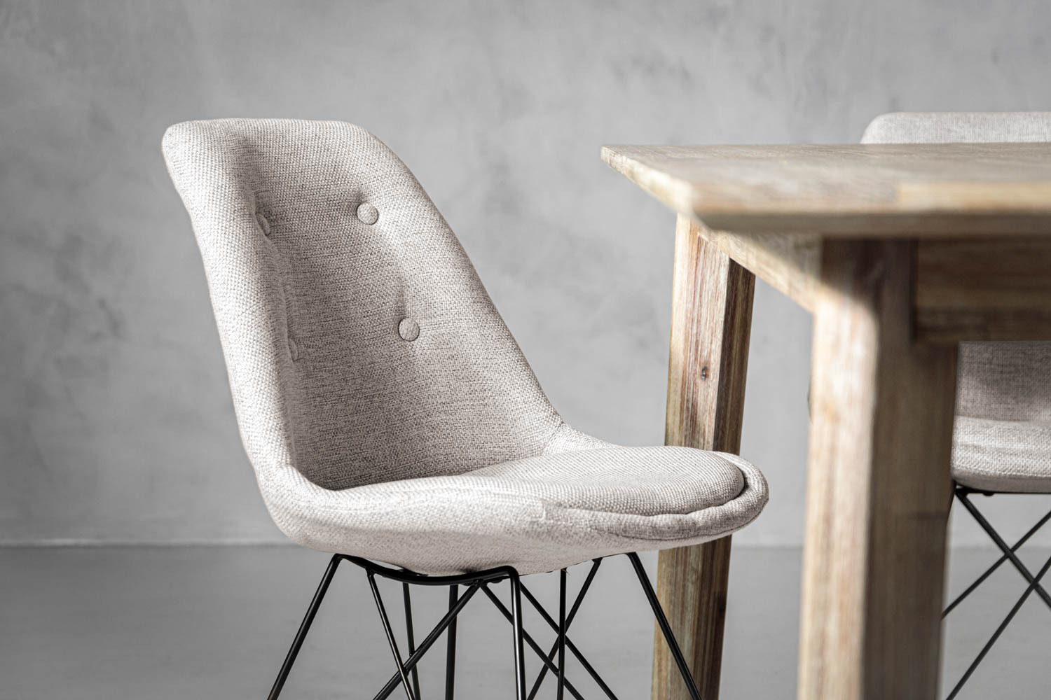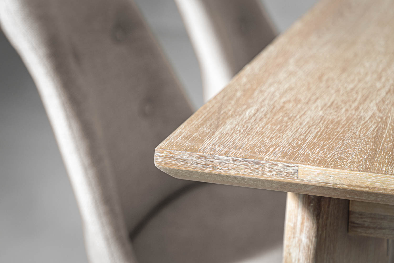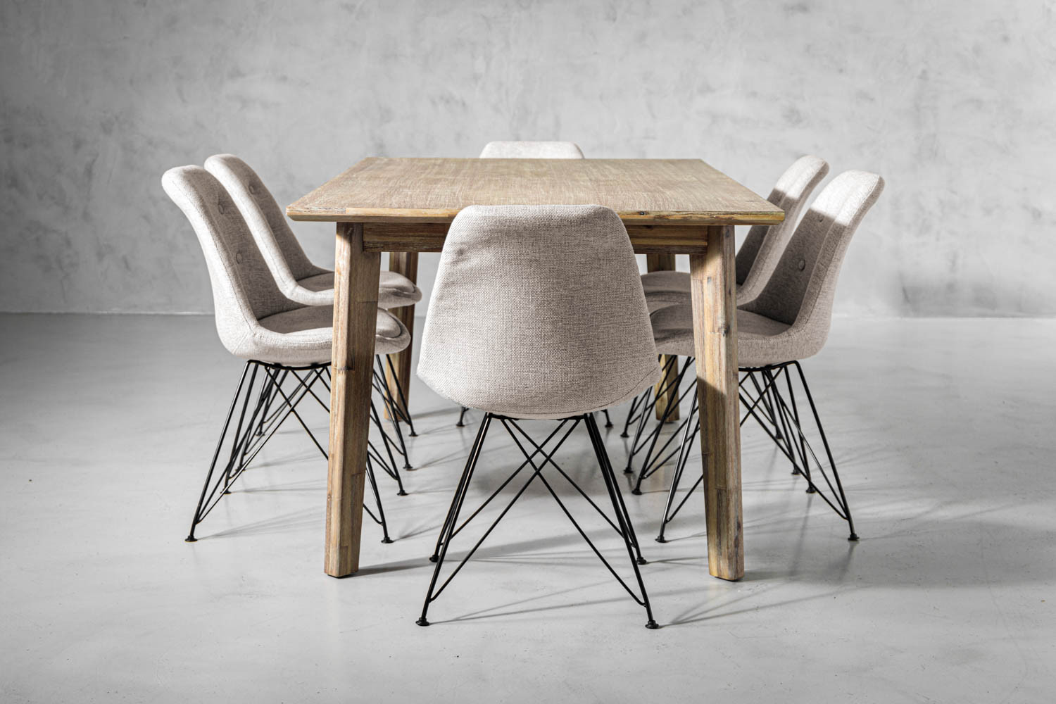 The exquisite Stanford Dining Table and Enzo Dining Chair, the perfect blend of modern elegance and functional charm. Elevate your dining experience with this stunning set, designed to transform your mealtimes into unforgettable gatherings. Crafted with precision, the Stanford Dining Table boasts a sleek, sturdy design that exudes sophistication. Its rich, Acacia Wood with wire brush finish adds a touch of warmth to any space. Accompanying it are the Enzo Dining Chairs, their contemporary silhouette ensuring both comfort and style.