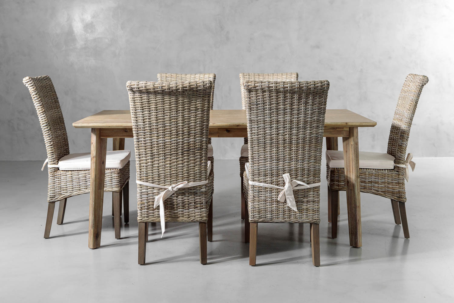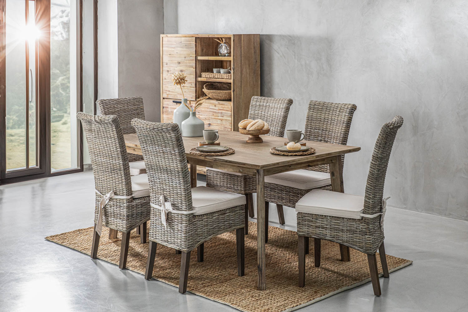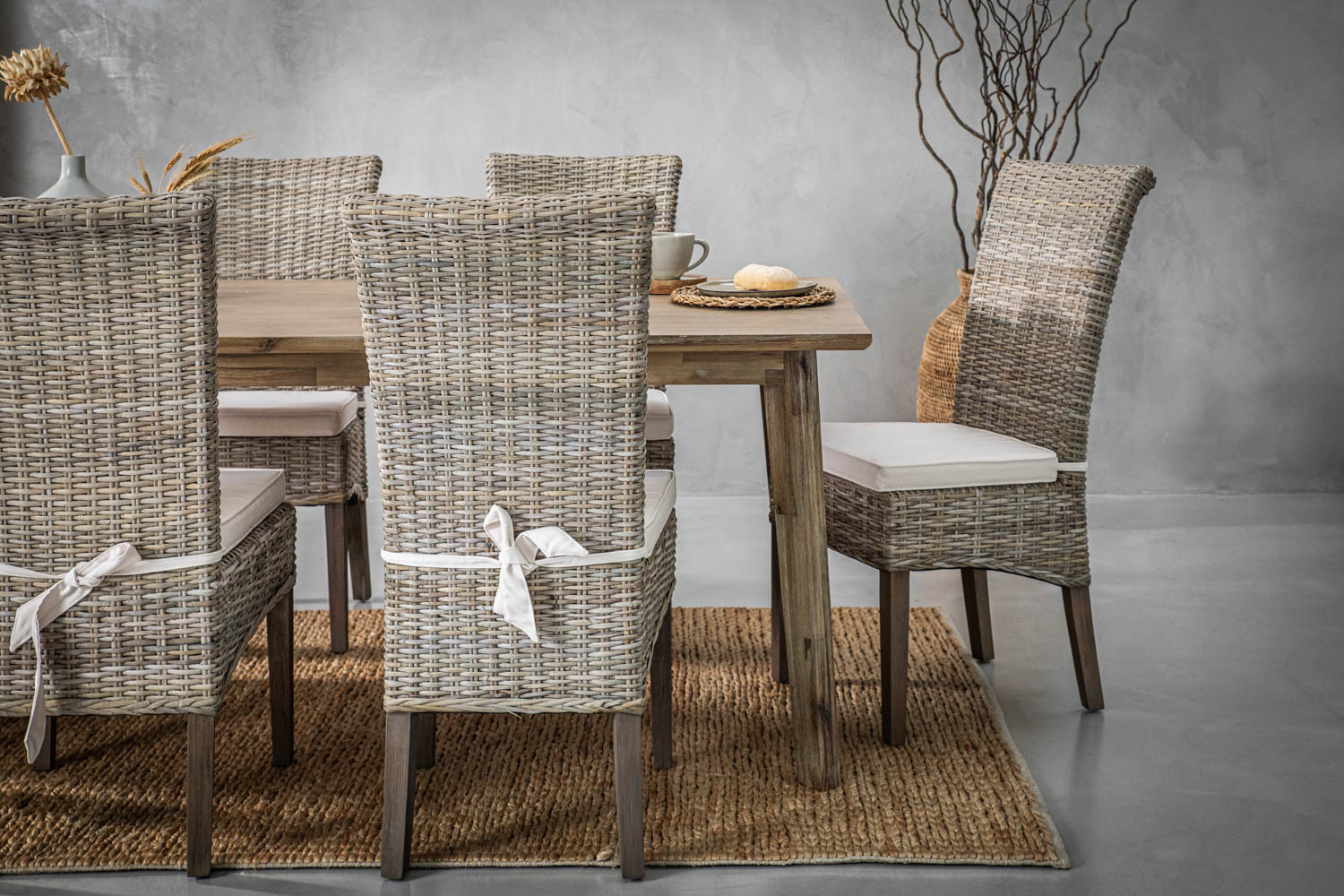The epitome of timeless elegance: the Stanford Dining Table and Sahara Dining Chair set. Crafted to perfection, this dining ensemble effortlessly combines sophistication and comfort, making every meal a cherished affair. The Stanford Dining Table boasts a sleek wood design that exudes warmth, while the Sahara Dining Chairs provide plush seating with a touch of refined charm from its natural rattan design.