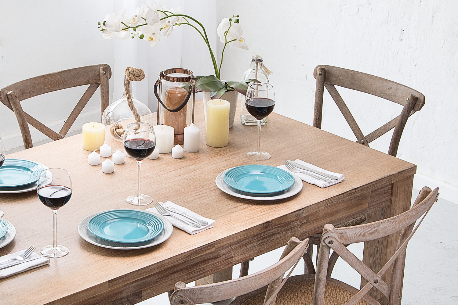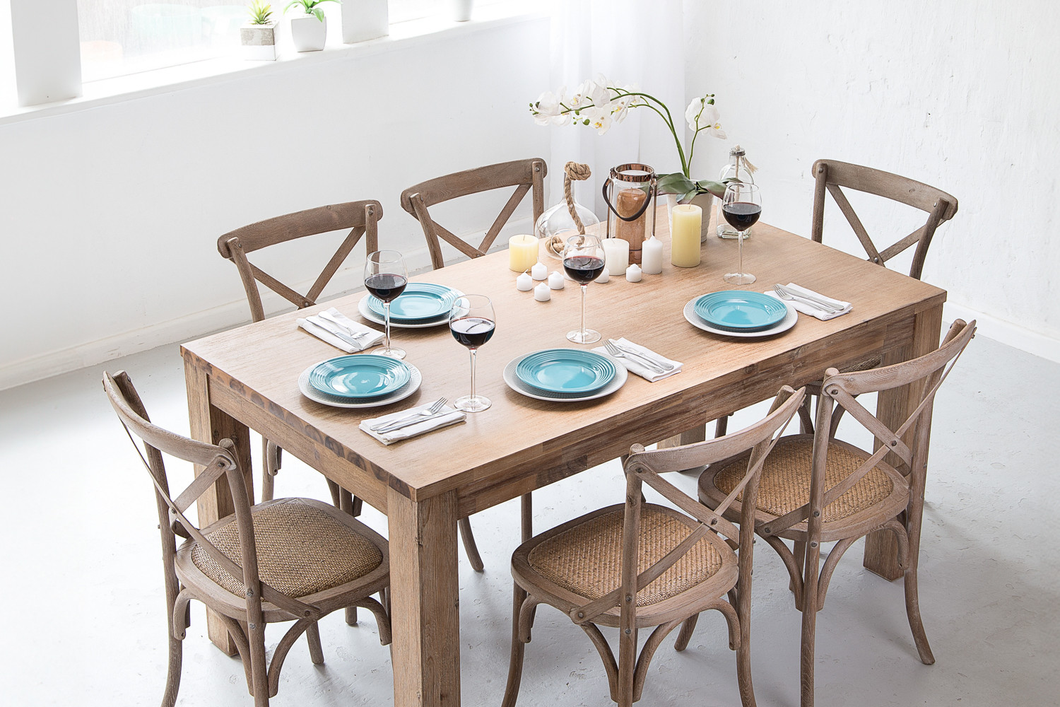 The Vancouver Dining Set boasts a robust dining table built from solid Acacia wood - a high density hardwood known for its durability – which is sure to remain the centre of your dining space for decades to come. The table is beautifully paired with 6 Provance dining chairs inspired by French country living – featuring a distinctive cross back design and constructed from solid oak, complete with a rattan weave seat padded for many comfortable hours of dinner conversation. The Wire brushing technique works beautifully to bring out the unique grain of both types of wood, giving both the table and chairs a slightly weathered look.