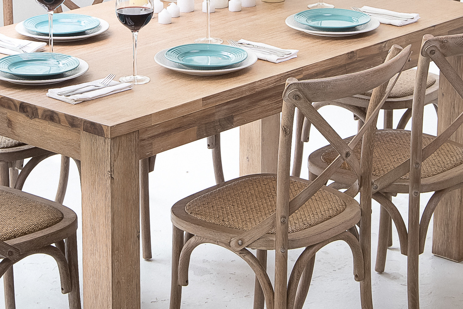 The Vancouver Dining Set boasts a robust dining table built from solid Acacia wood - a high density hardwood known for its durability – which is sure to remain the centre of your dining space for decades to come. The table is beautifully paired with 6 Provance dining chairs inspired by French country living – featuring a distinctive cross back design and constructed from solid oak, complete with a rattan weave seat padded for many comfortable hours of dinner conversation. The Wire brushing technique works beautifully to bring out the unique grain of both types of wood, giving both the table and chairs a slightly weathered look.