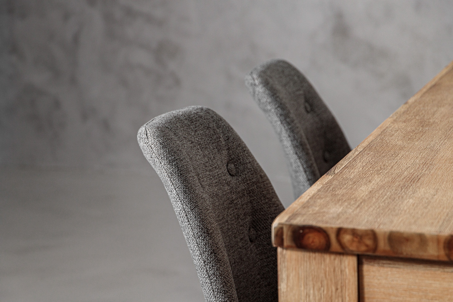 The table is paired with 8 Enzo dining chairs inspired by the classic Eames chair, featuring steel Eiffel legs and upholstered in velvet with a distinctive weathered look and buttoned detail on the chair back.