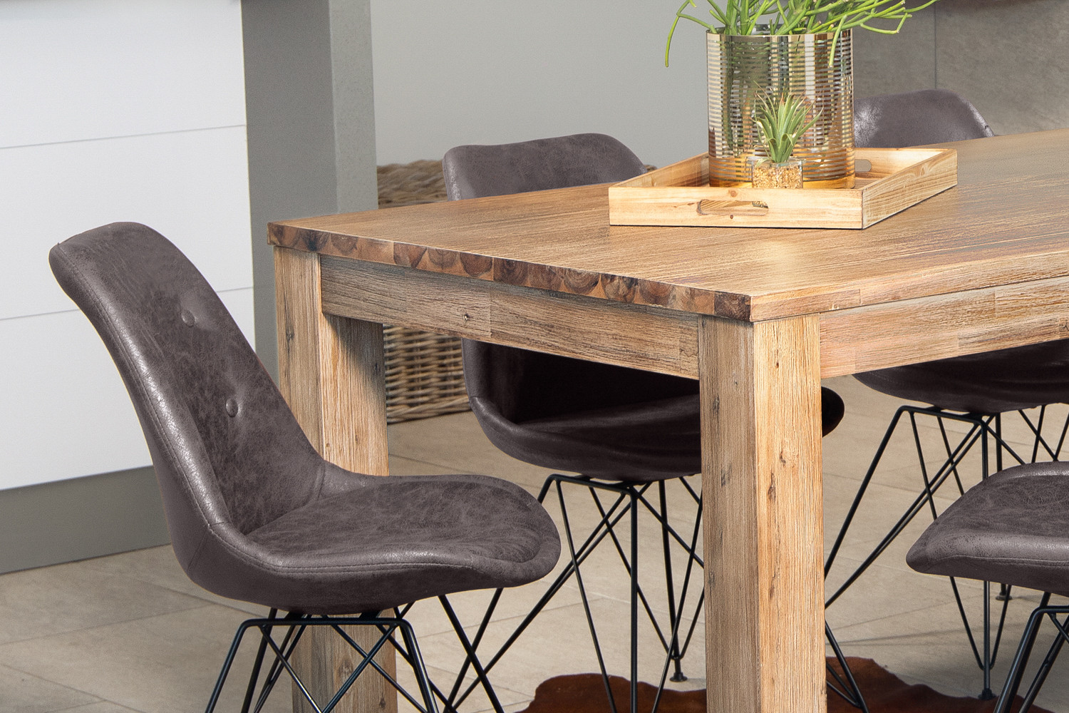The Vancouver Enzo Dining Set boasts a robust 1.6m dining table built from solid Acacia wood - a high density hardwood known for its durability – which is sure to remain the centre of your dining space for decades to come. Wire brushing gives this piece a beautifully natural, slightly rustic finish.