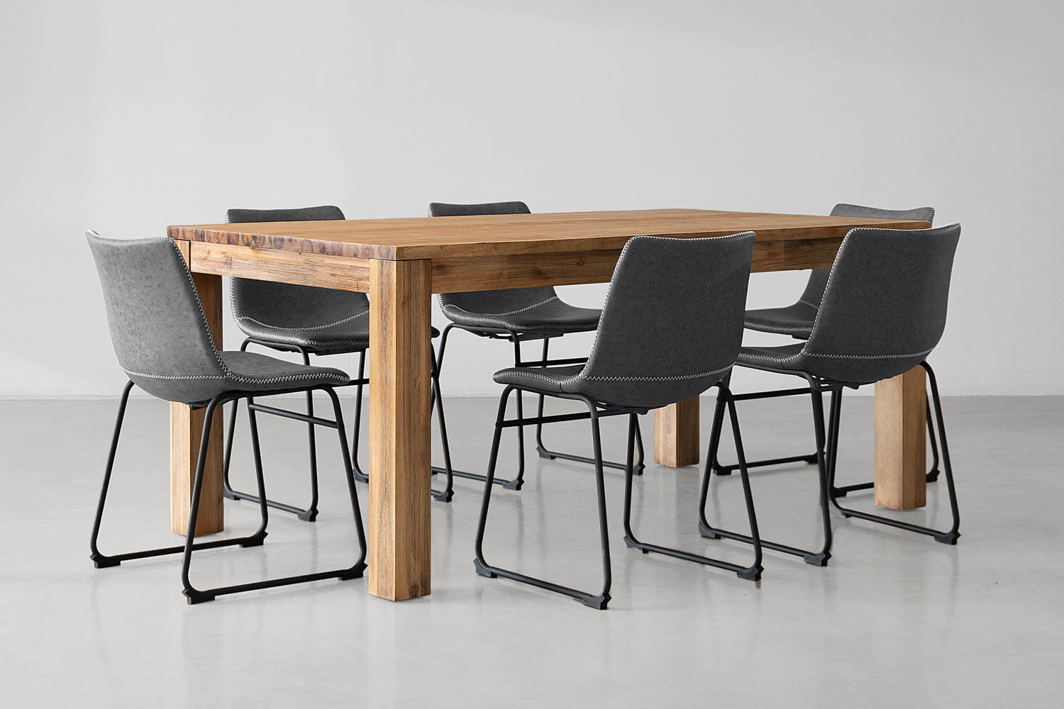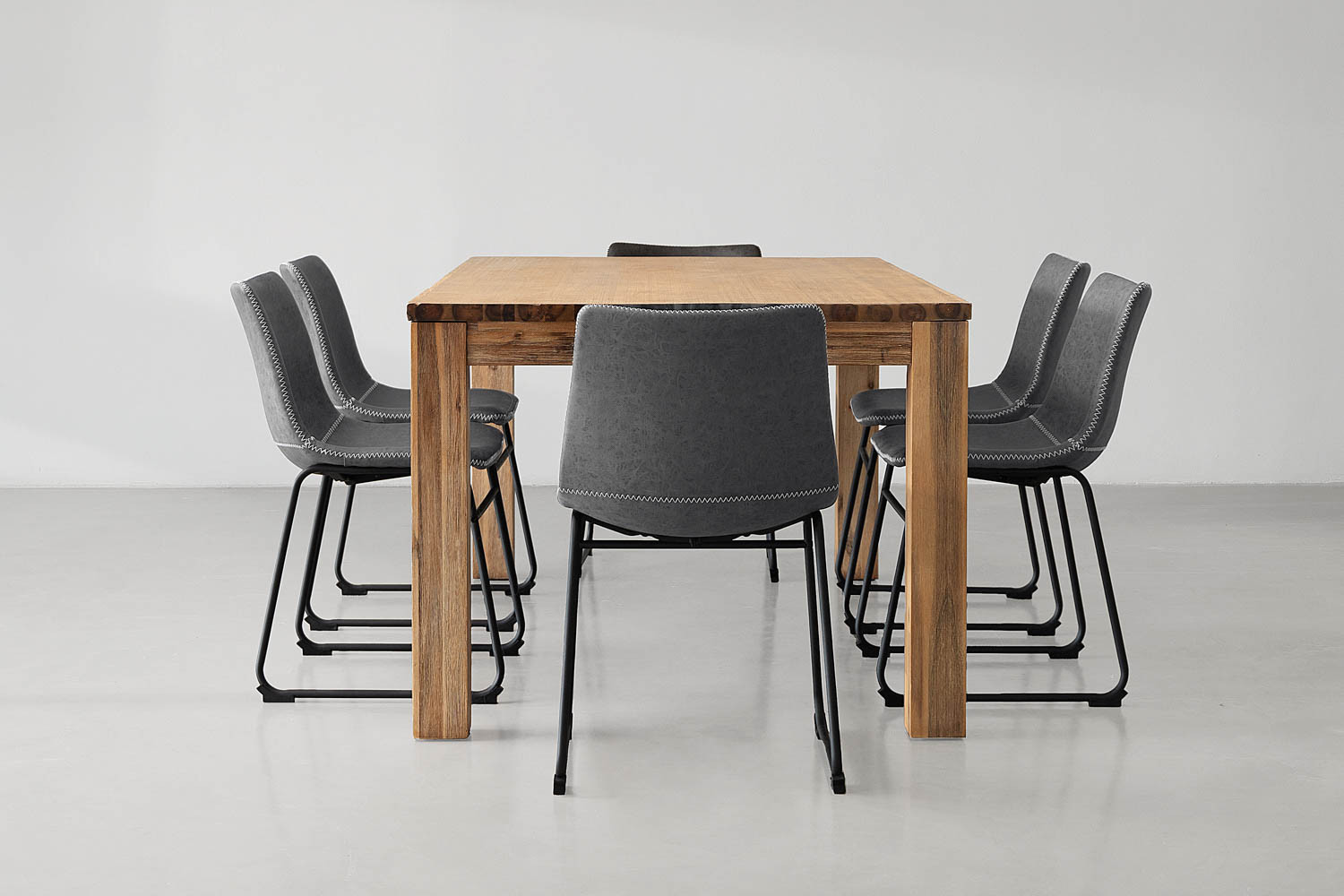 The table is paired with six Halo Dining Chairs, featuring steel legs and upholstered in high-quality microfibre fabric with a distinctive weathered look and zig-zag contrast stitching. The combination of neutral tones and mild rustic finishes gives this set character that will be a highlight in any modern home.