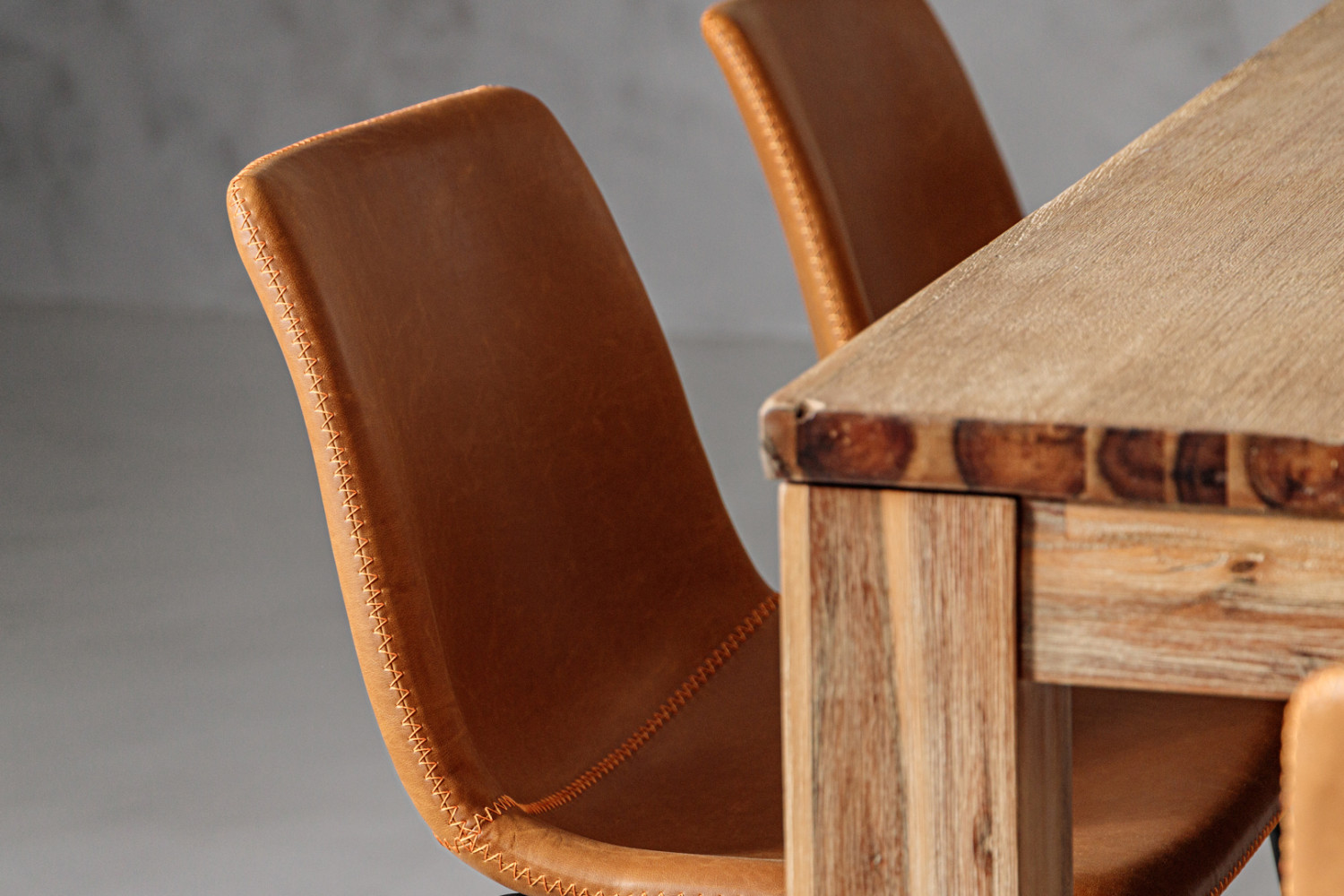 The table is paired with six Halo Dining Chairs, featuring steel legs and upholstered in high-quality microfibre fabric with a distinctive weathered look and zig-zag contrast stitching. The combination of neutral tones and mild rustic finishes gives this set character that will be a highlight in any modern home.