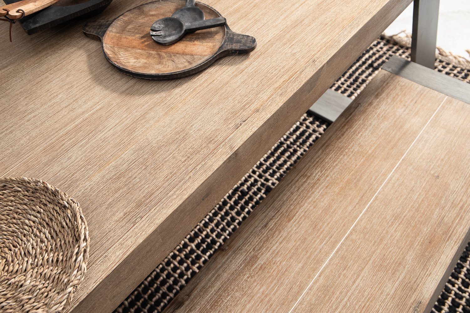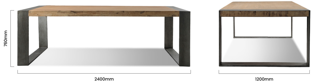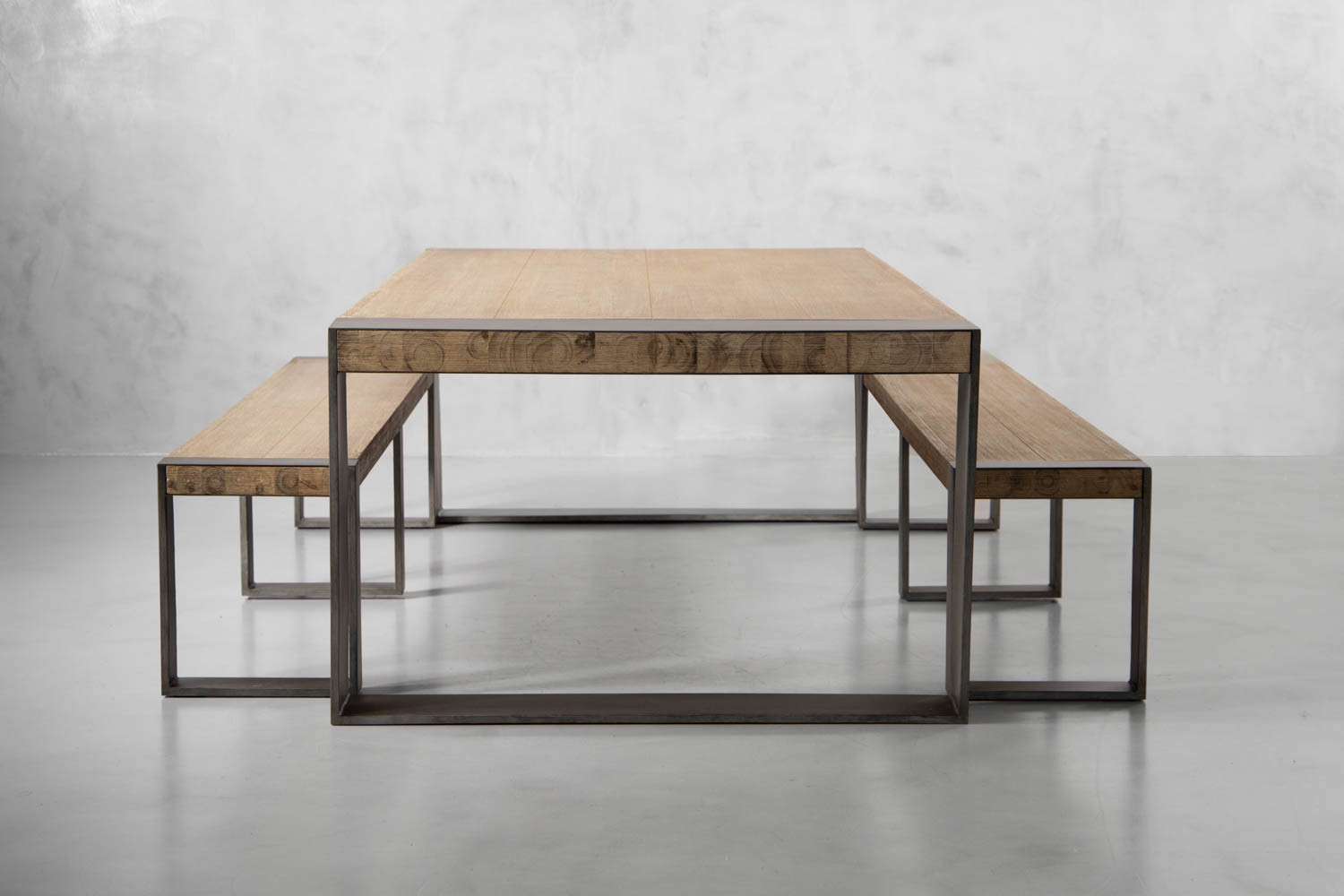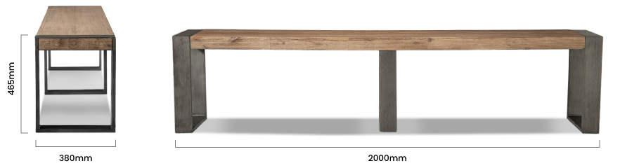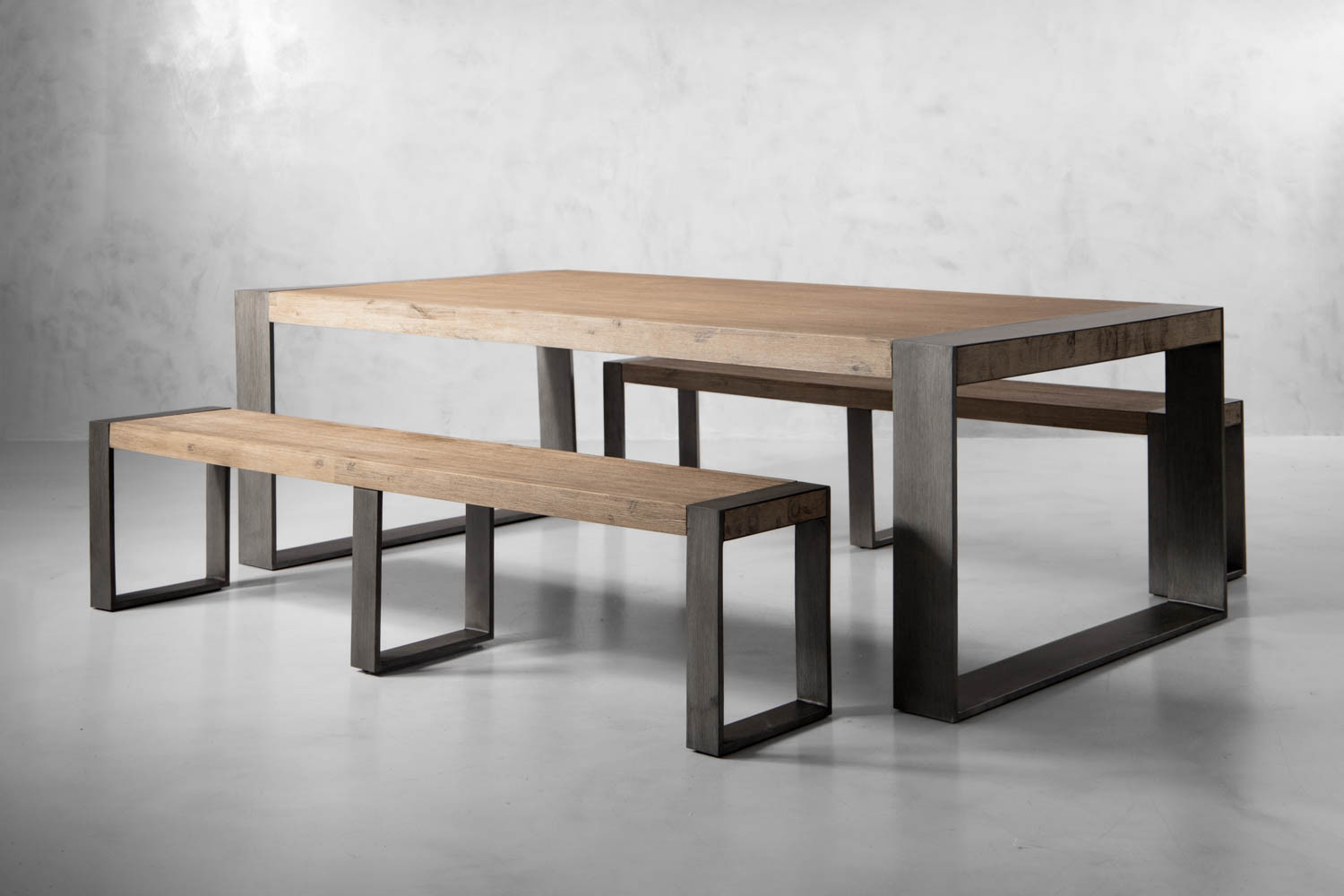 The dining table and benchs are both constructed from solid Acacia wood with veneers – a dense hardwood with exceptional durability which provides a superior aesthetic and protects the wood from expanding or splitting due to temperature variance. The wire brush technique works beautifully to bring out the unique grain of this wood, while giving it a slightly weathered look that will hide any accidental scratches.