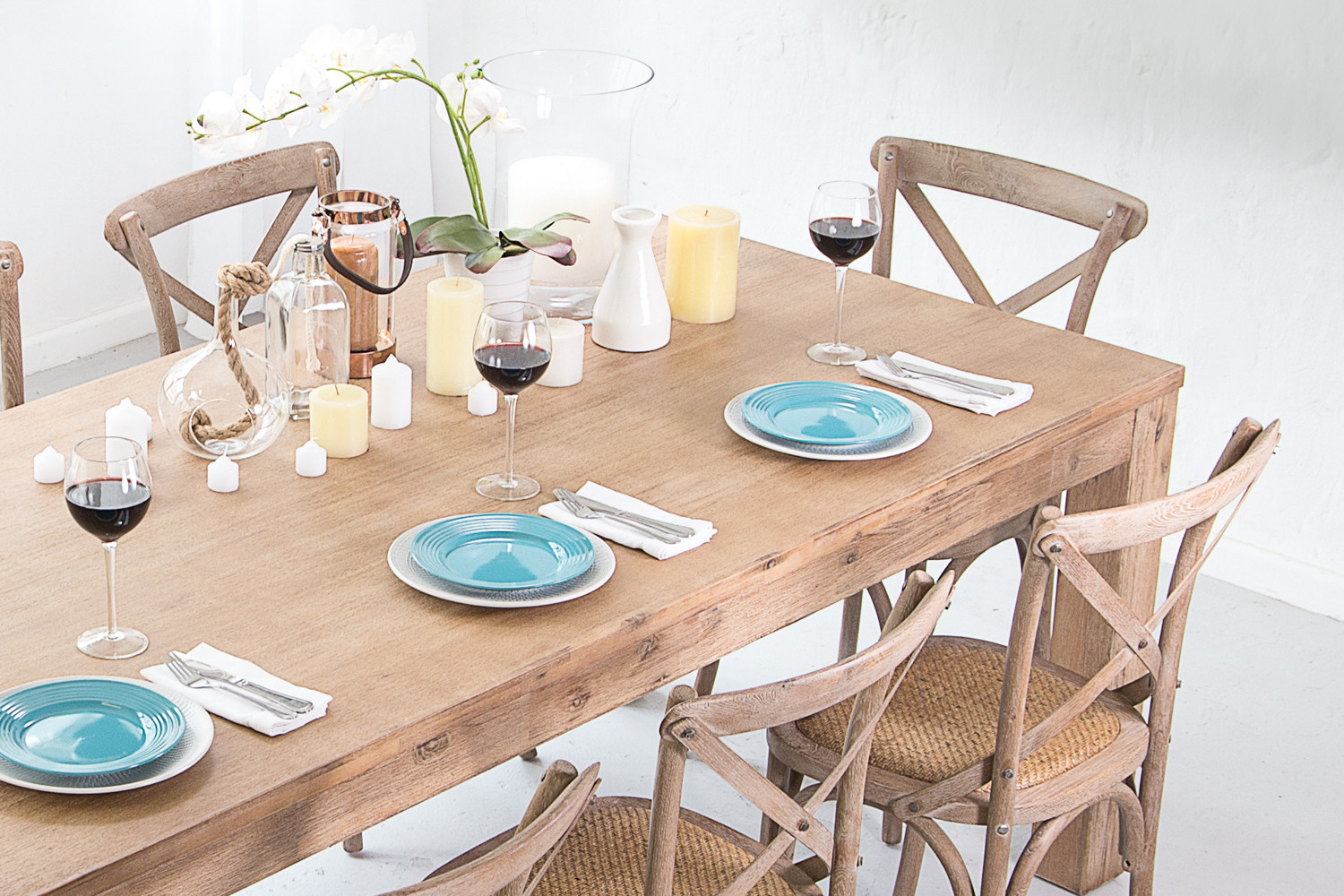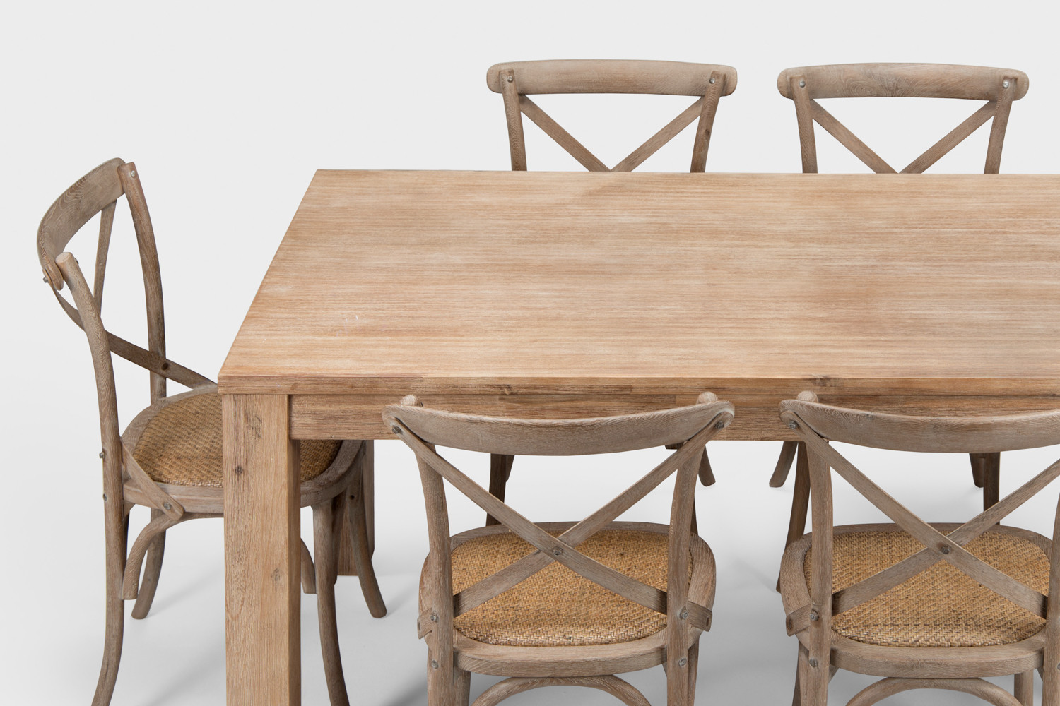 The Vancouver Dining Set boasts a robust dining table built from solid Acacia wood - a high density hardwood known for its durability – which is sure to remain the centre of your dining space for decades to come. The table is beautifully paired with 6 Provance dining chairs inspired by French country living – featuring a distinctive cross back design and constructed from solid oak, complete with a rattan weave seat padded for many comfortable hours of dinner conversation. The Wire brushing technique works beautifully to bring out the unique grain of both types of wood, giving both the table and chairs a slightly weathered look.