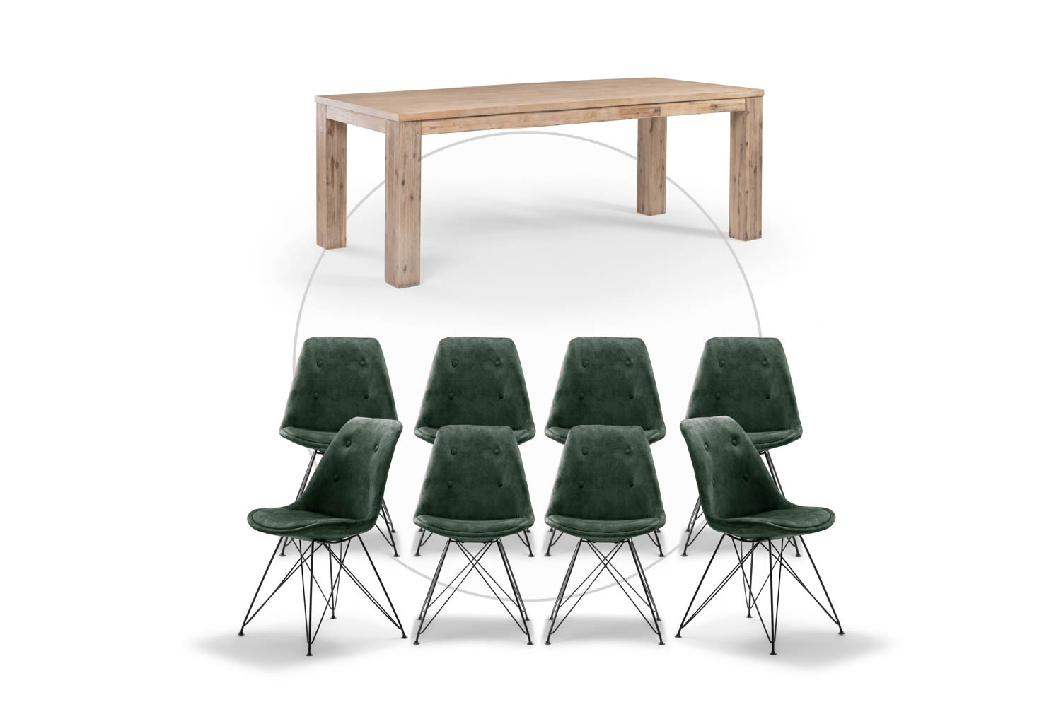 The table is paired with 8 Enzo dining chairs inspired by the classic Eames chair, featuring steel Eiffel legs and upholstered in velvet with a distinctive weathered look and buttoned detail on the chair back.