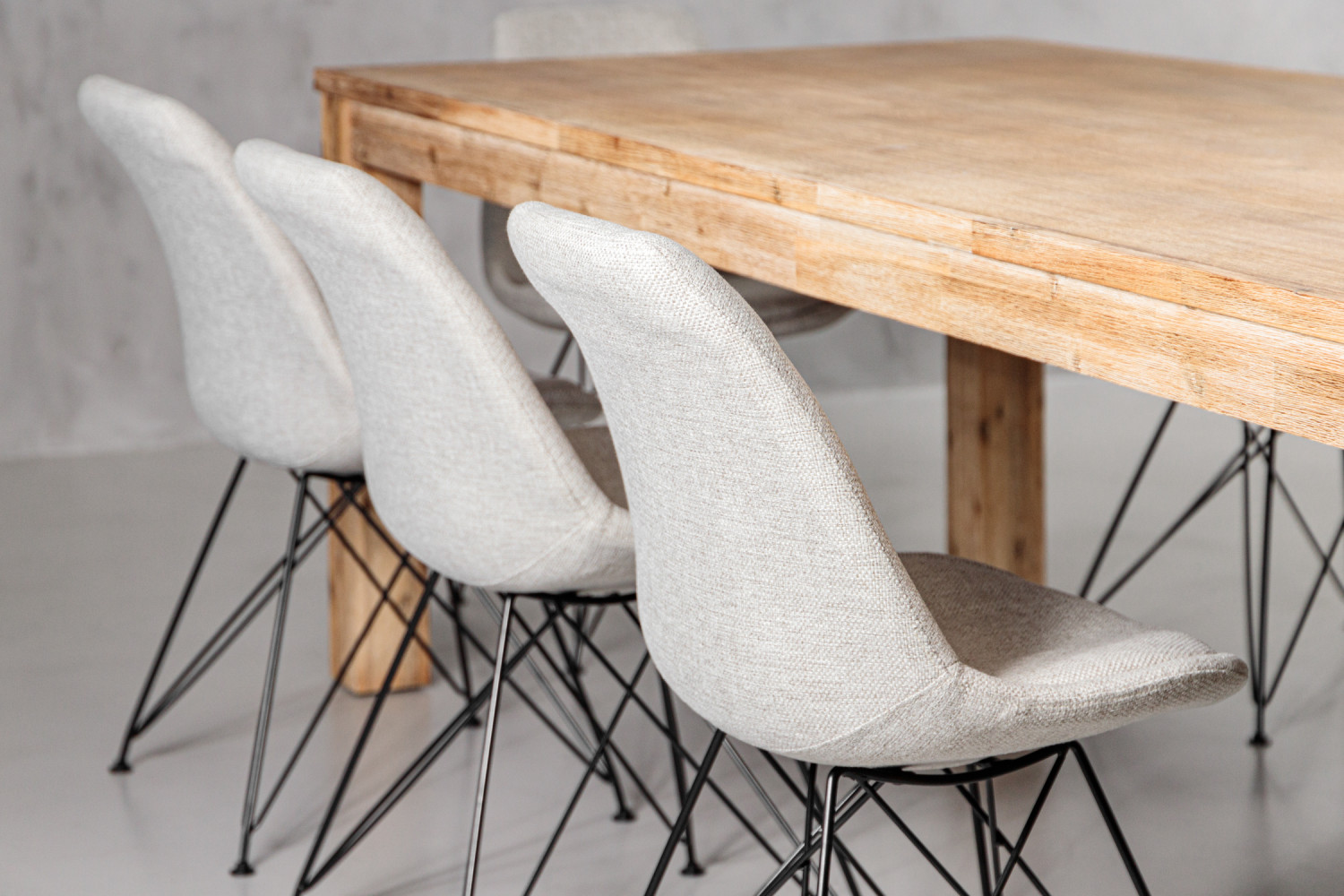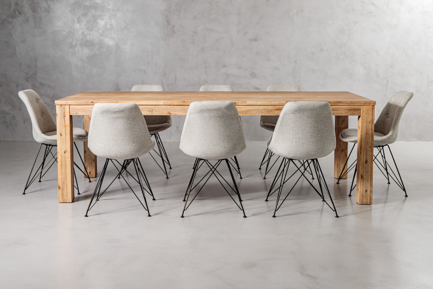 The table is paired with 8 Enzo dining chairs inspired by the classic Eames chair, featuring steel Eiffel legs and upholstered in velvet with a distinctive weathered look and buttoned detail on the chair back.