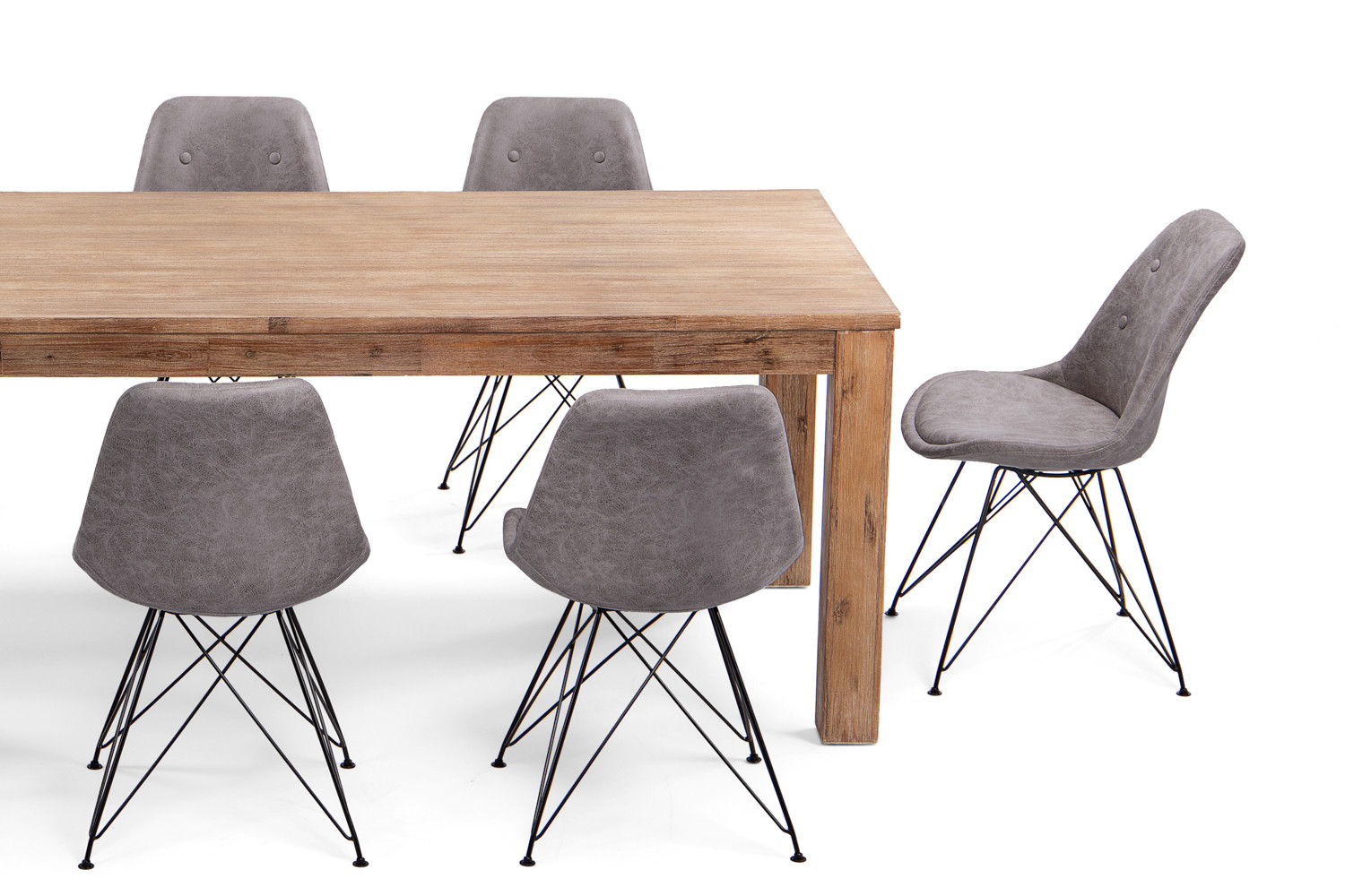 The table is paired with 8 Enzo dining chairs inspired by the classic Eames chair, featuring steel Eiffel legs and upholstered in microfibre with a distinctive weathered look and buttoned detail on the chair back (available in vintage brown, stone and grey). The combination of neutral tones, mild rustic finishes and a touch of vintage class gives this set a character of its own that’s sure to be a highlight of any modern home.
