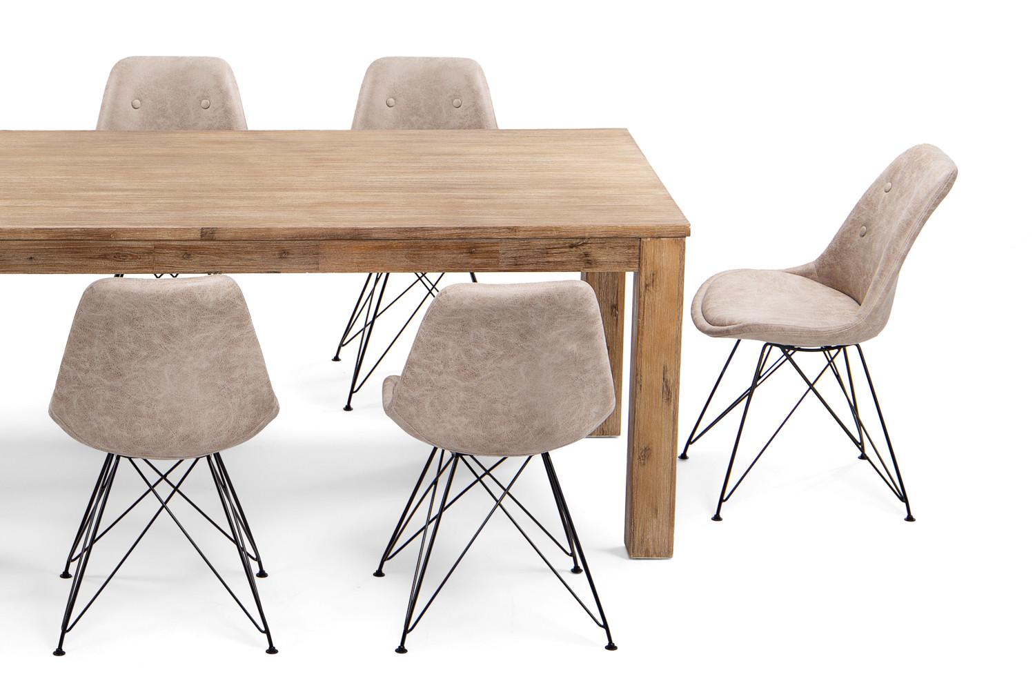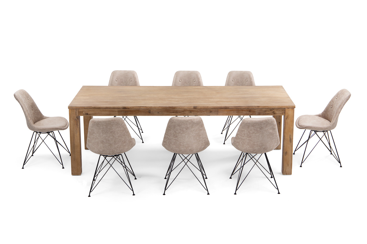 The table is paired with 8 Enzo dining chairs inspired by the classic Eames chair, featuring steel Eiffel legs and upholstered in microfibre with a distinctive weathered look and buttoned detail on the chair back (available in vintage brown, stone and grey). The combination of neutral tones, mild rustic finishes and a touch of vintage class gives this set a character of its own that’s sure to be a highlight of any modern home.