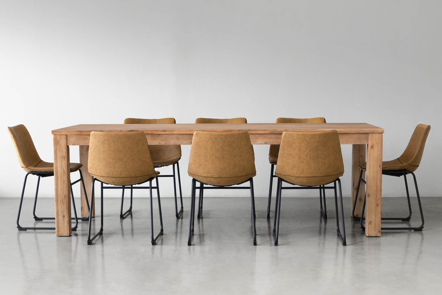 The table is paired with eight Halo Dining Chairs, featuring steel legs and upholstered in high-quality microfibre fabric with a distinctive weathered look and zig-zag contrast stitching. The combination of neutral tones and mild rustic finishes gives this set character that will be a highlight in any modern home.