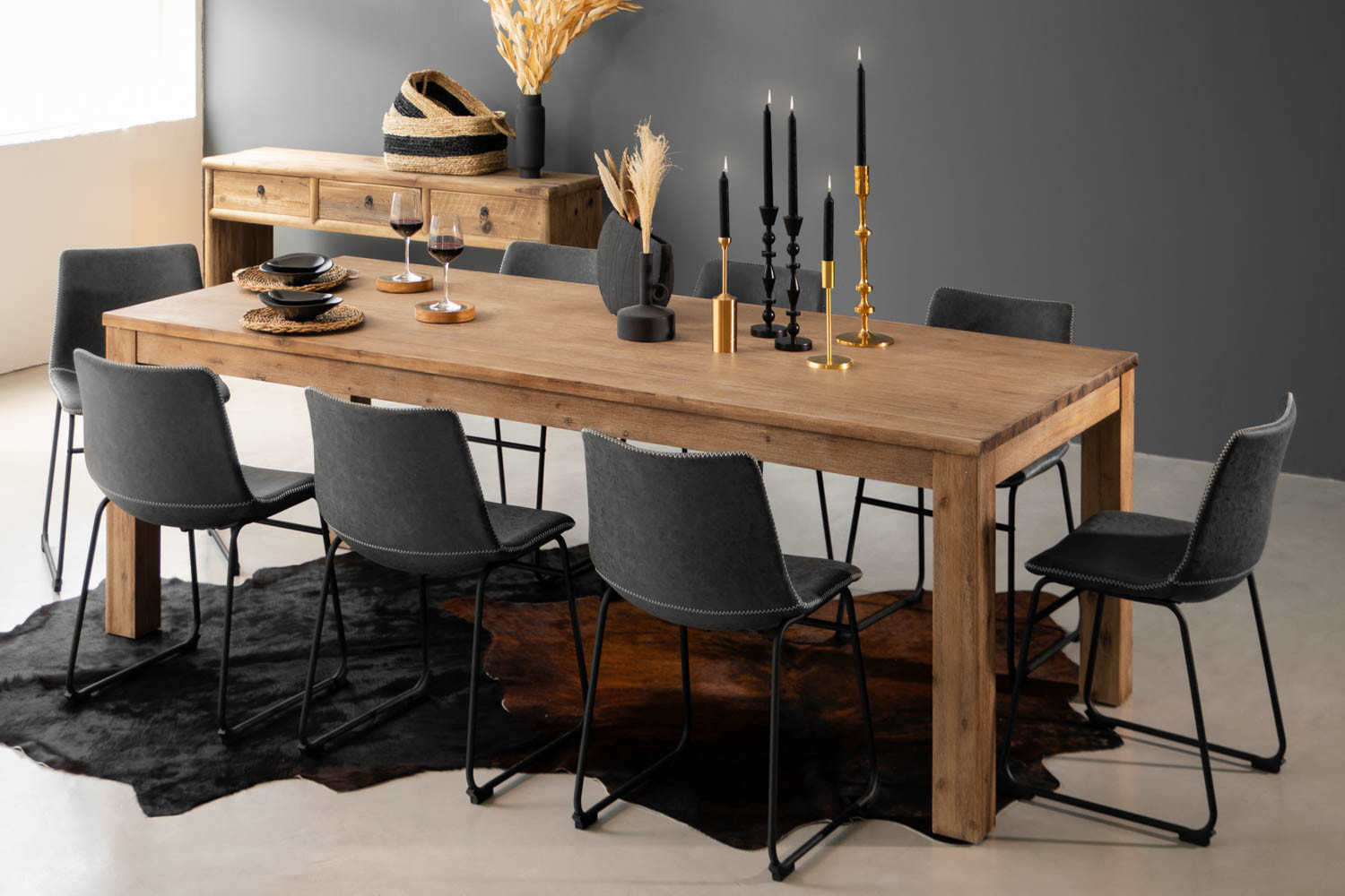 The table is paired with eight Halo Dining Chairs, featuring steel legs and upholstered in high-quality microfibre fabric with a distinctive weathered look and zig-zag contrast stitching. The combination of neutral tones and mild rustic finishes gives this set character that will be a highlight in any modern home.