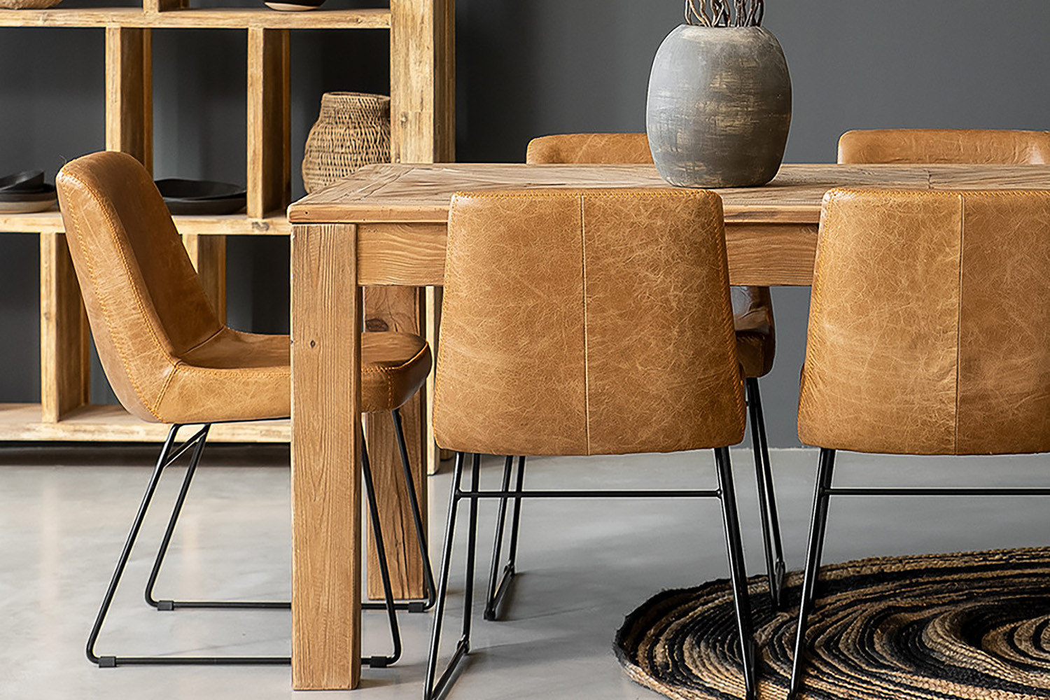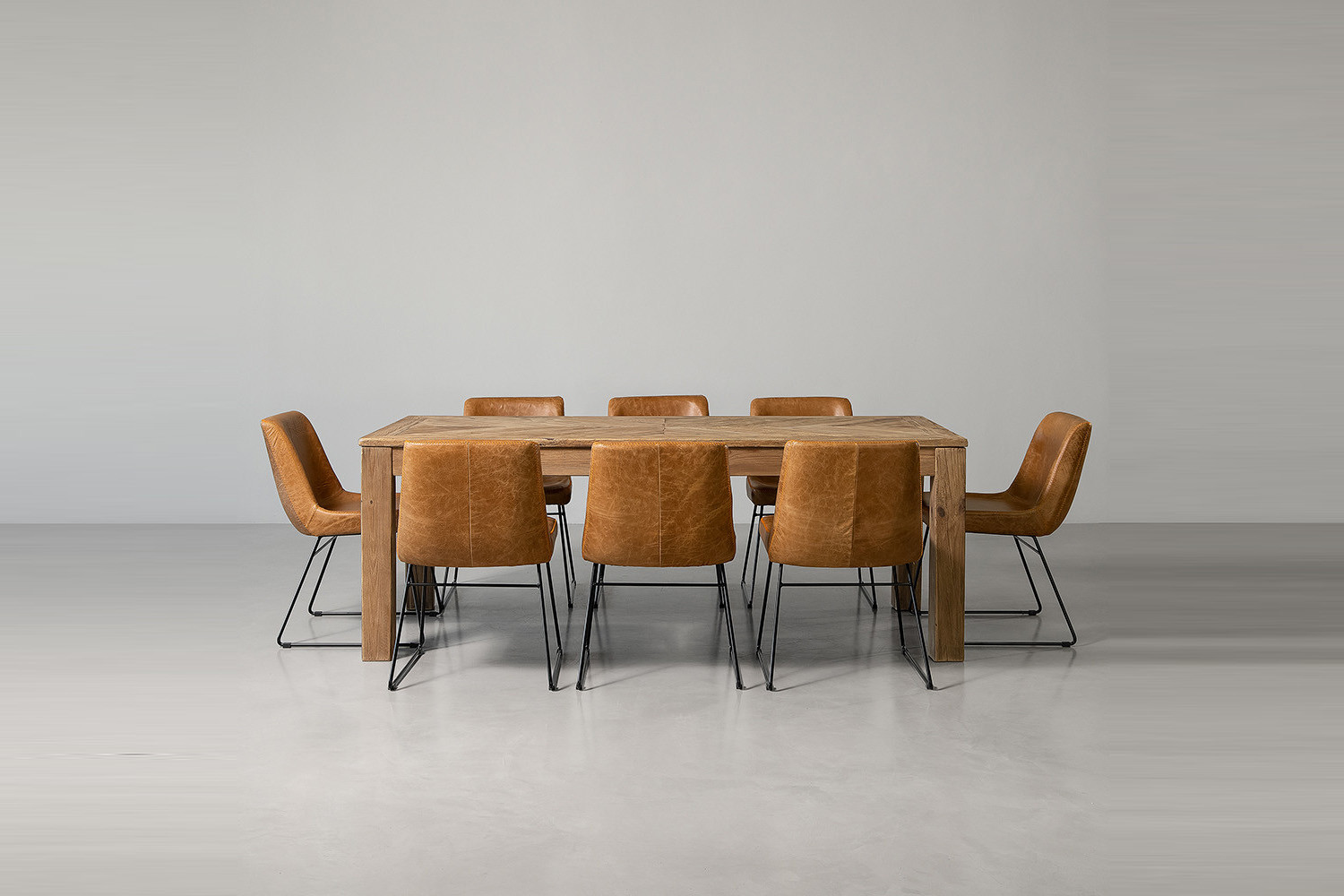 The Volantis Jordan Dining Set welcomes a contemporary dining staple with a sleek modern aesthetic and natural feel. The full grain leather combines with the authenticity of reclaimed pine to create a comfortable and durable dining set.
