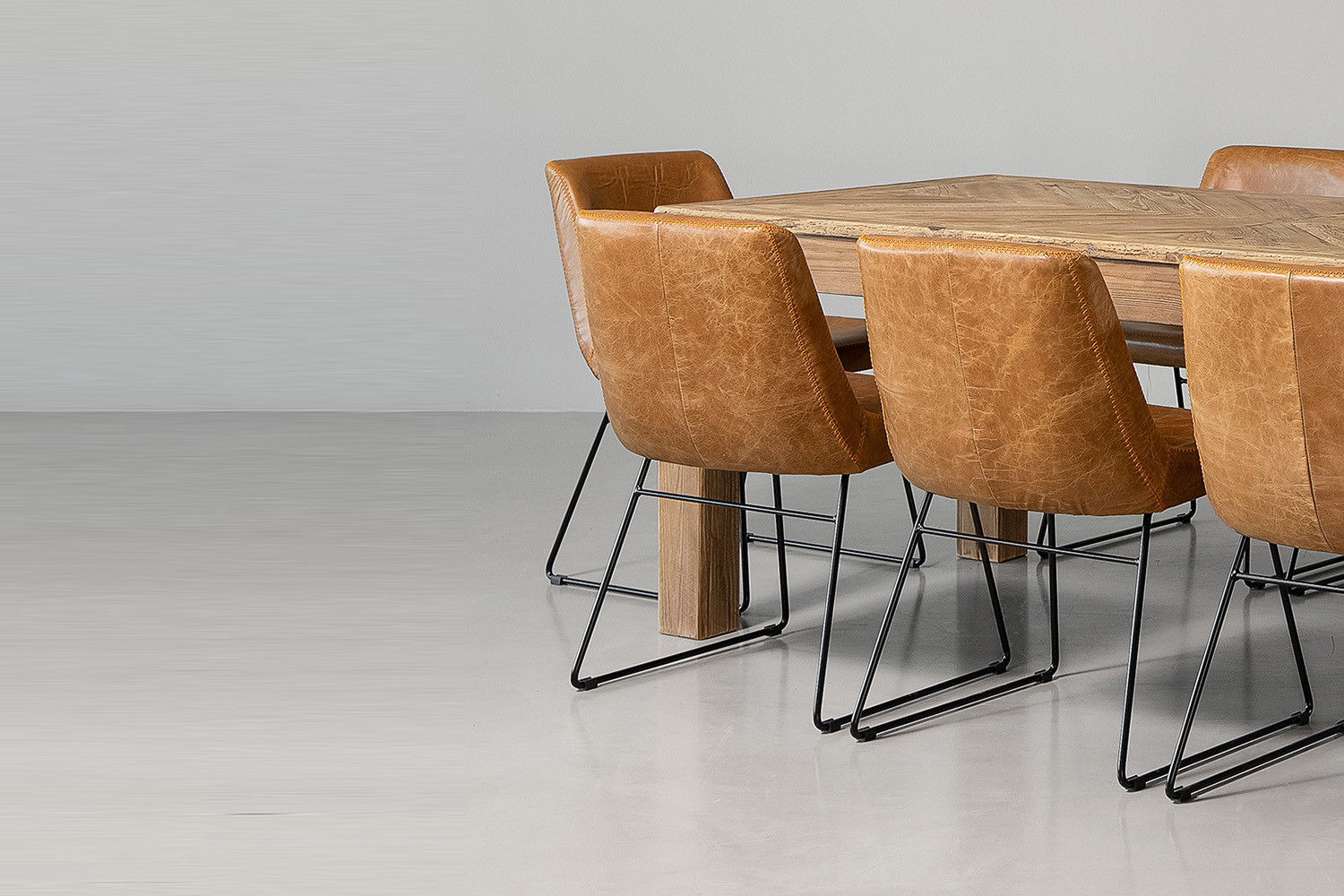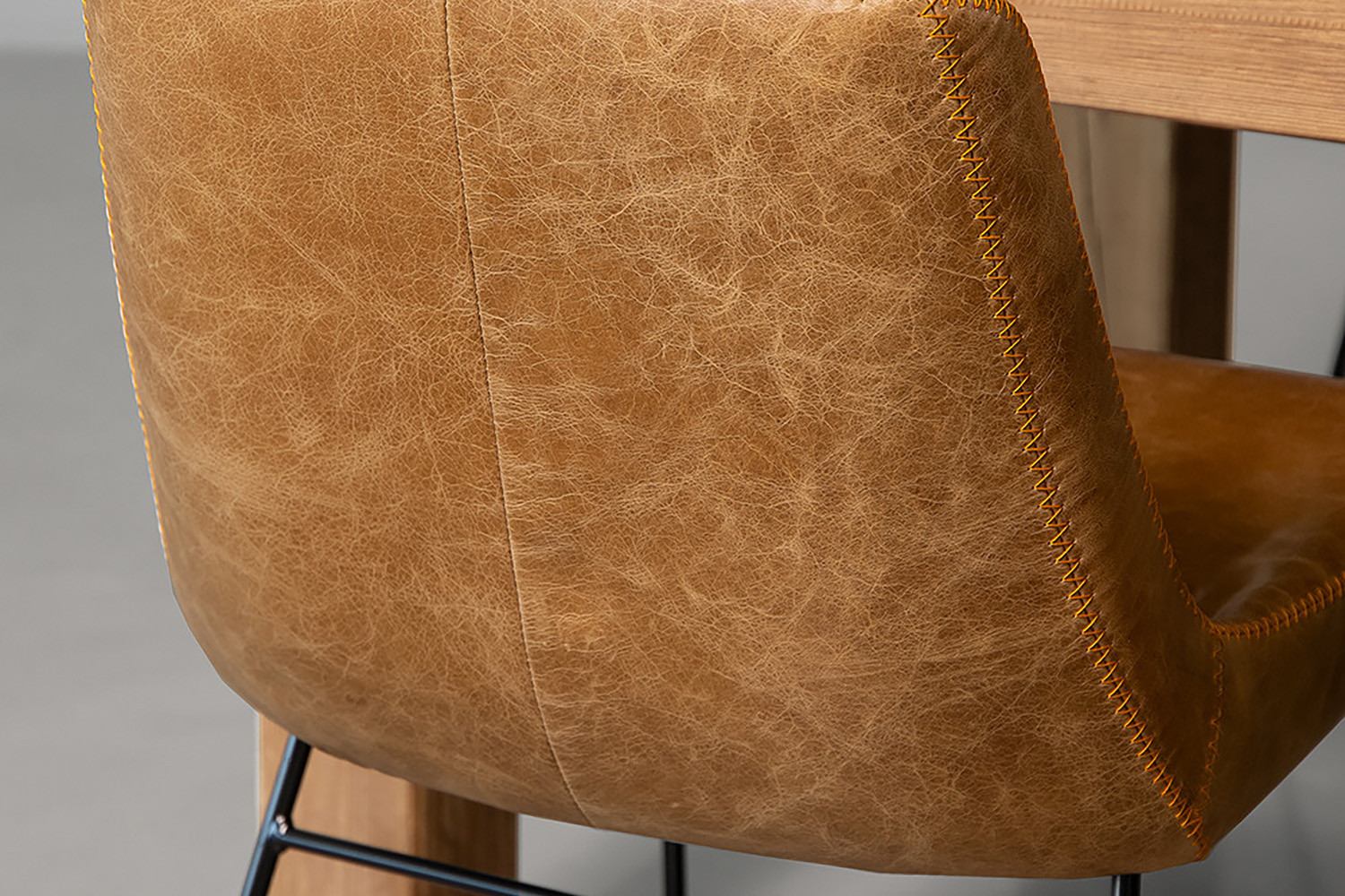 The Jordan Leather Dining Chair welcomes an all-new contemporary dining staple with its sleek modern aesthetic and natural feel. Upholstered in high quality full-grain leather and supported by a powder coated steel frame. This dining chair, with its vintage style and exposed stitching, will provide a simple yet comfortable chair.