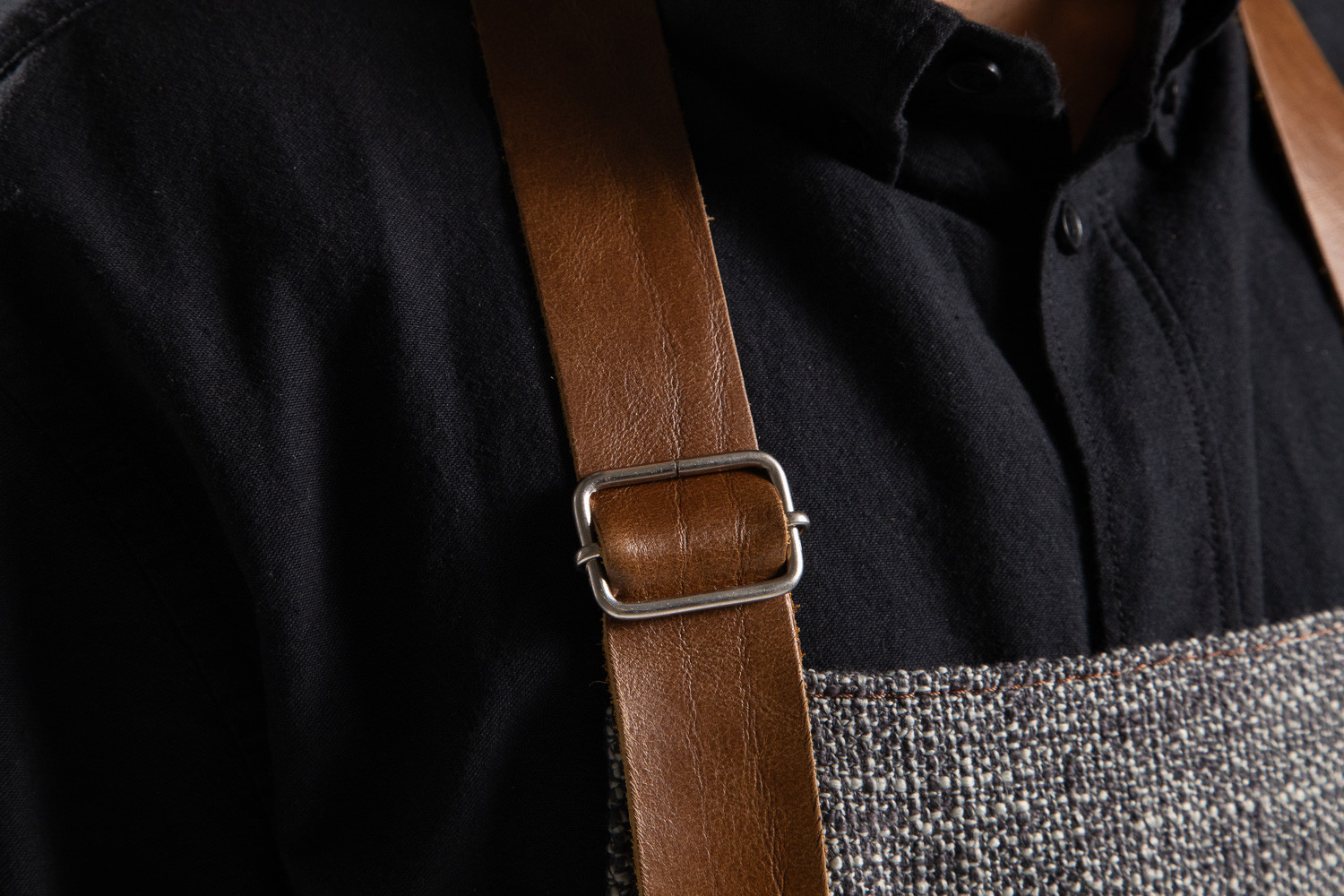 The Nouvelle Apron is crafted for those who demand quality and style in their everyday tools. Featuring a beautifully woven fabric in a deep grey hue, this apron is accentuated by rich brown leather detailing, complete with an adjustable neck strap and a functional leather patch pocket for quick access to essentials. Whether you're grilling, slicing, or serving, the Nouvelle Apron is the perfect choice for kitchen artisans.