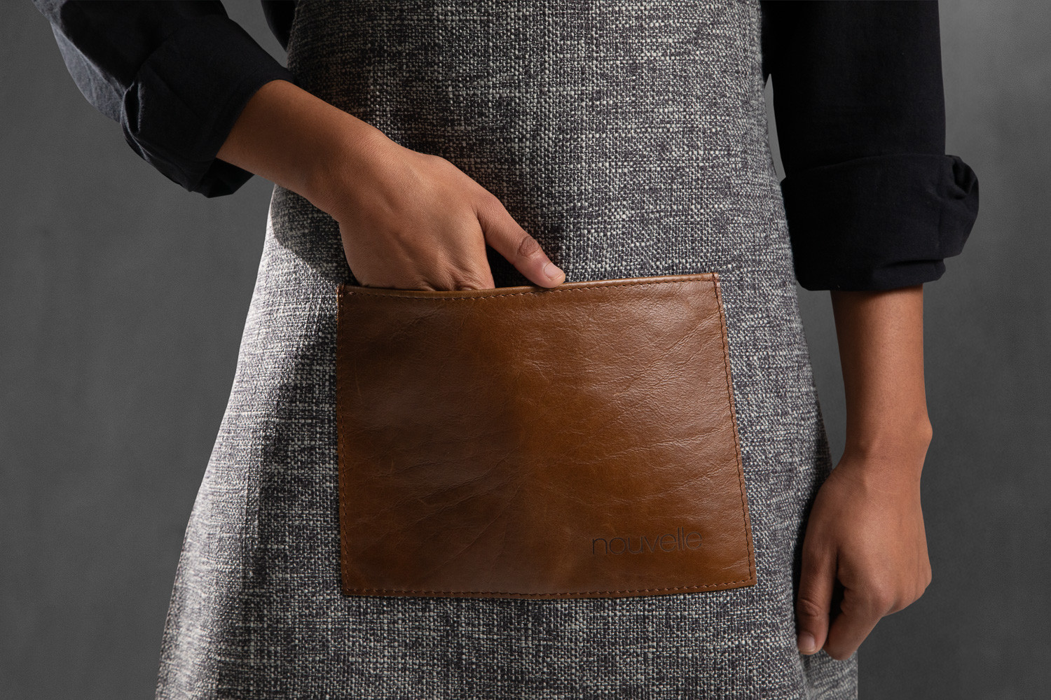 Complete your kitchen workspace with a finely crafted Nouvelle Apron. Designed for modern culinary enthusiasts, this apron pairs a textured grey-toned fabric with straps and a front pocket made from luxurious full-grain leather. Durable, stylish, and made to move with you, it offers protection, practicality, and a professional edge to any kitchen task.
