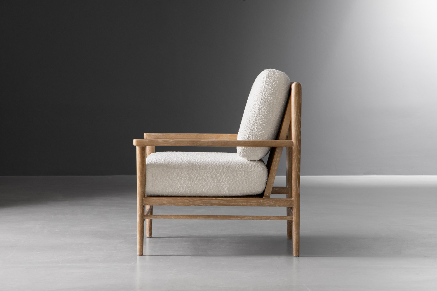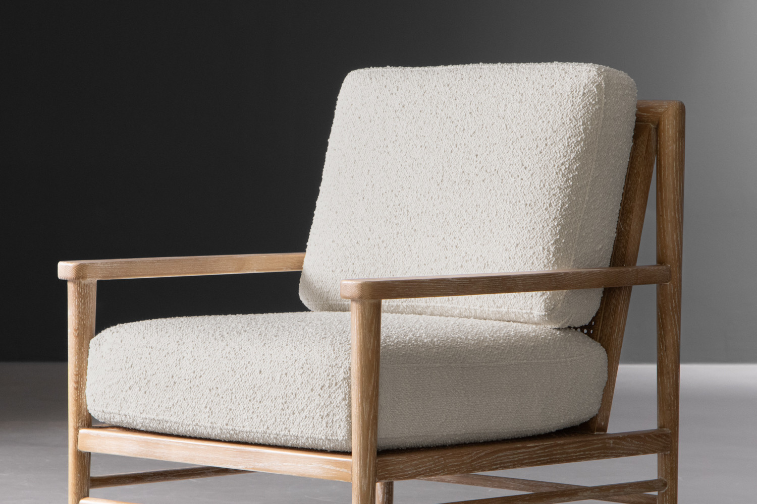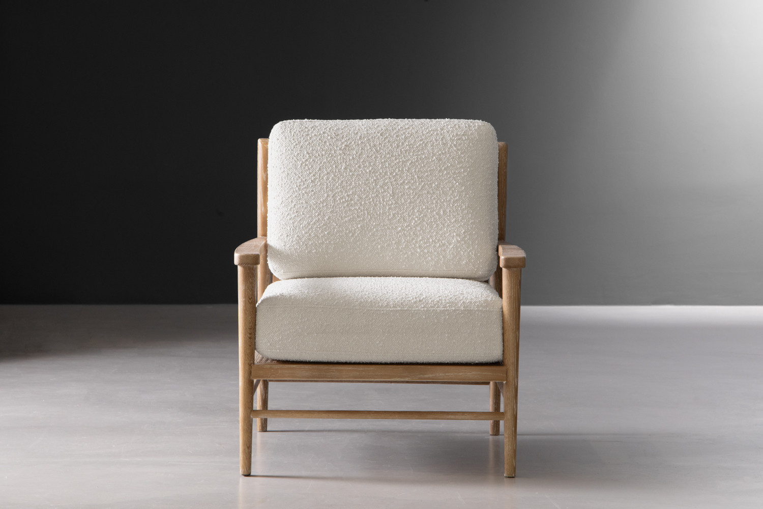 The Colton Armchair offers a perfect blend of modern design and traditional comfort, making it an ideal addition to any living room or lounge. Its ash wood frame, meticulously crafted, pairs beautifully with the plush boucle fabric cushioning, available in a soft mist colour. This armchair's stylish design ensures it stands out, while its refined presence adds an air of sophistication to your space. The Colton provides a comfortable seating experience without sacrificing elegance, making it a must-have for those who appreciate both form and function.
