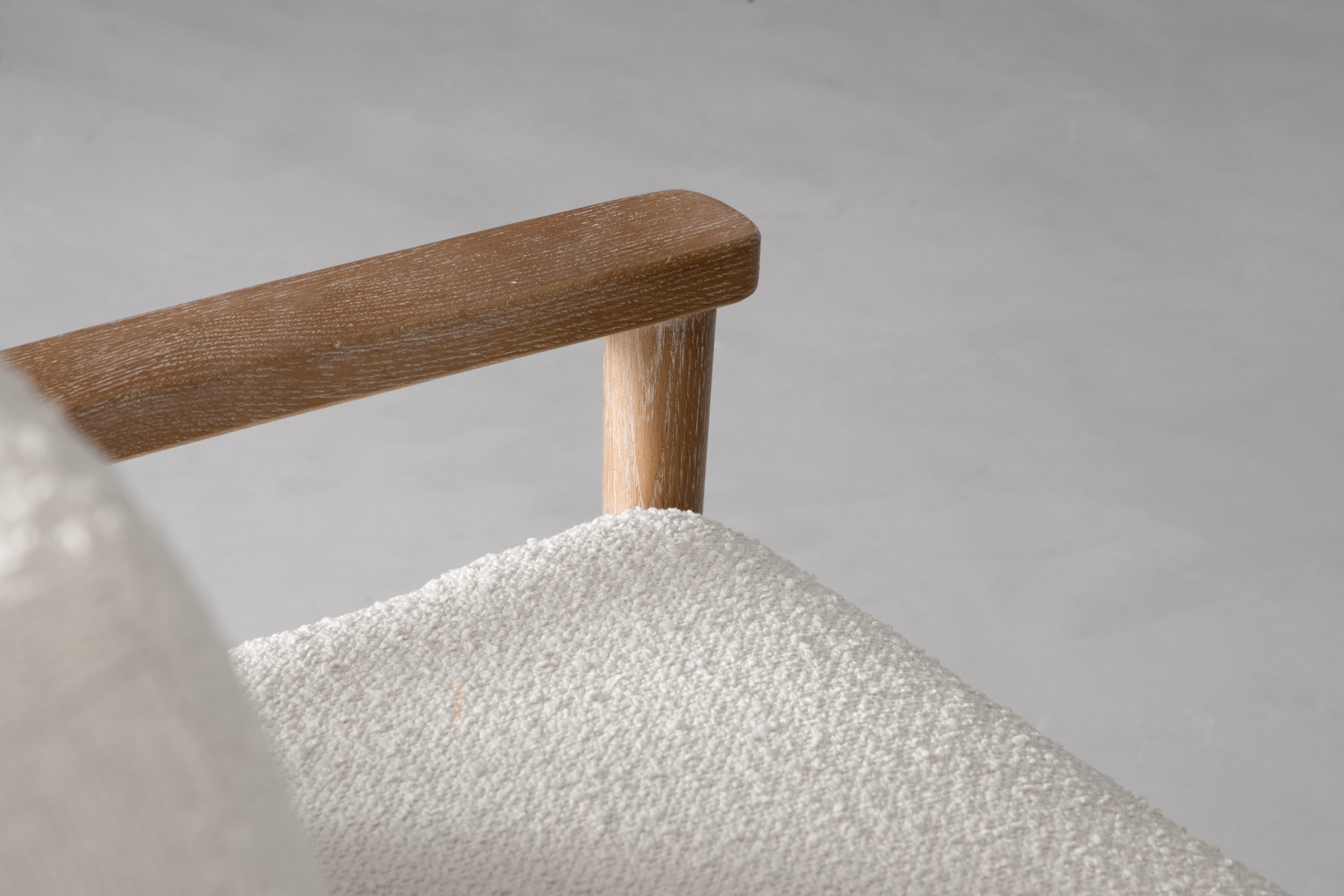 The cushioning is upholstered in high-quality boucle fabric, known for its soft, textured feel and durability. The Mist colour option adds a calming, neutral tone that effortlessly blends with various interior styles, from contemporary to classic. This plush seating ensures that the Colton Armchair is as comfortable as it is stylish, inviting you to relax and unwind.