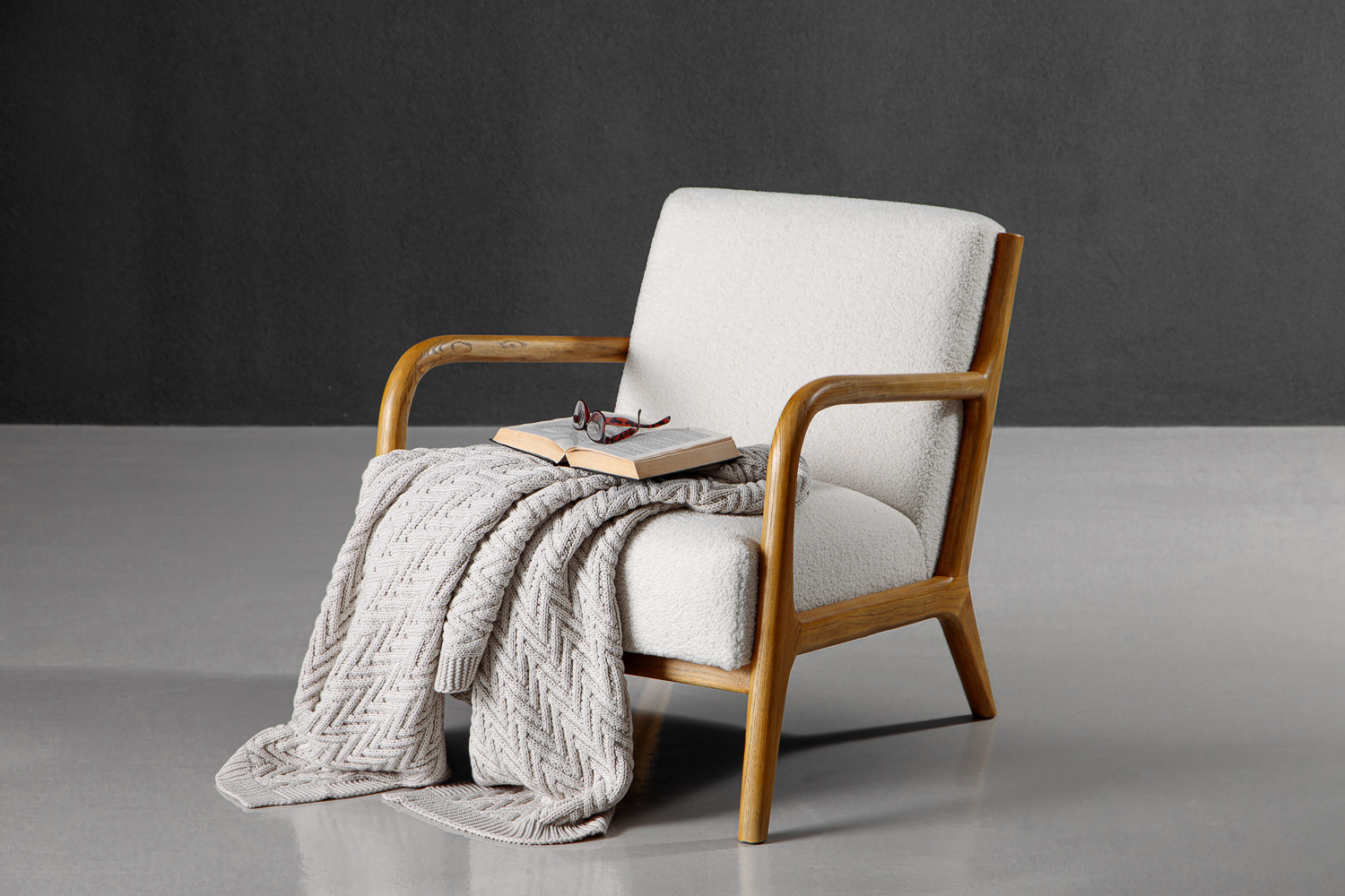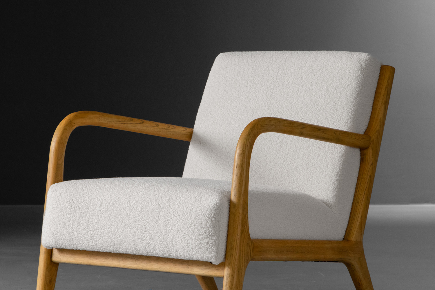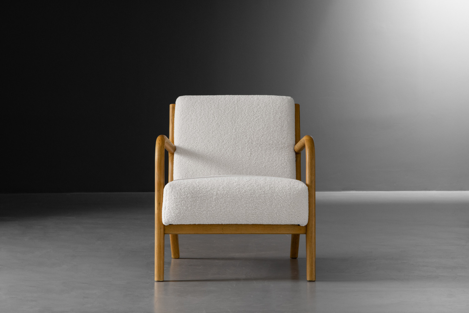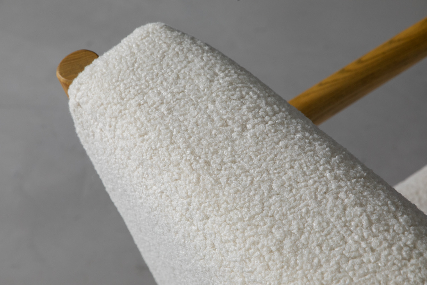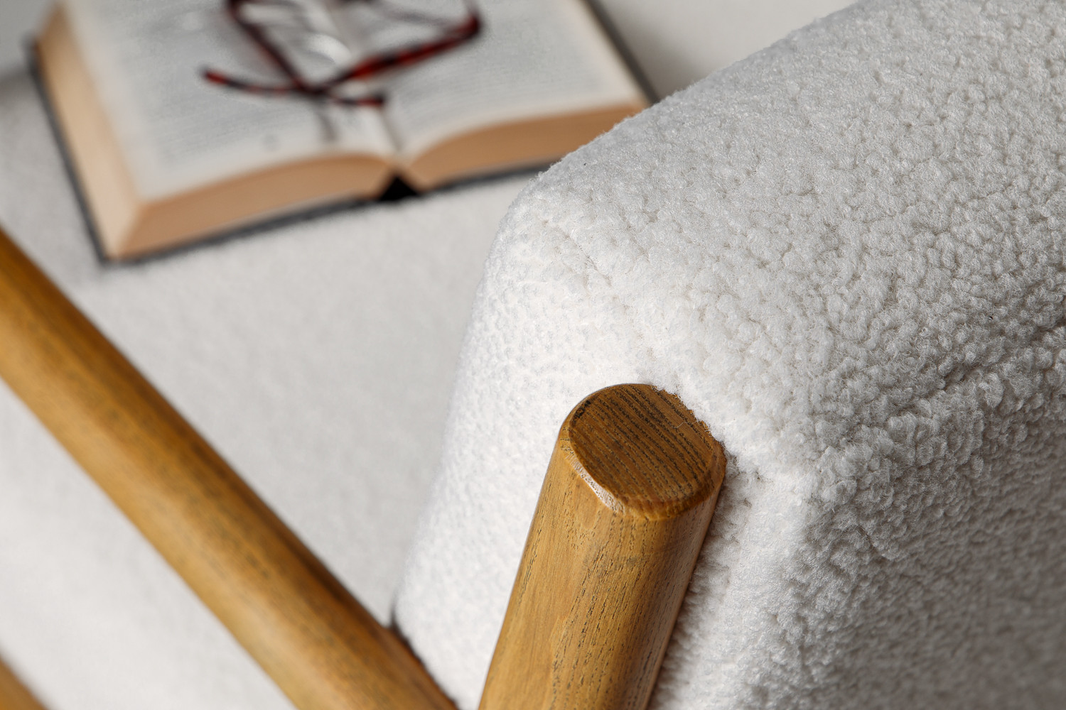 The frame of the Connor Armchair is expertly crafted from ashwood, known for its durability and natural beauty. The wood's rich grain adds a touch of warmth, making this armchair not just a piece of furniture, but a statement of style in your living room. The light tones of the ashwood frame contrast beautifully with the boucle fabric, creating a harmonious blend of materials that suits various interior styles.