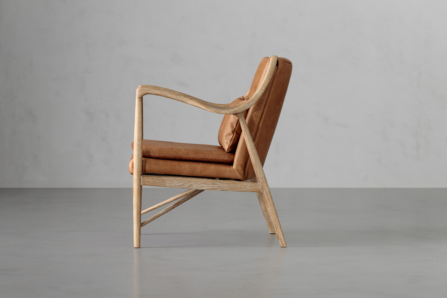 The Cordelia Leather Armchair is the ultimate embodiment of character and comfort. Its contoured ash wood frame and full grain leather seat are definitive touches of modern luxury. Sit back in its charming embrace and get a feel for elegant everyday living.