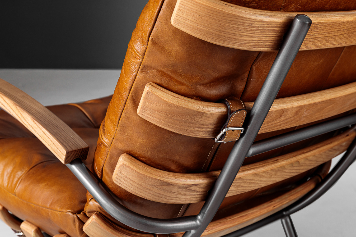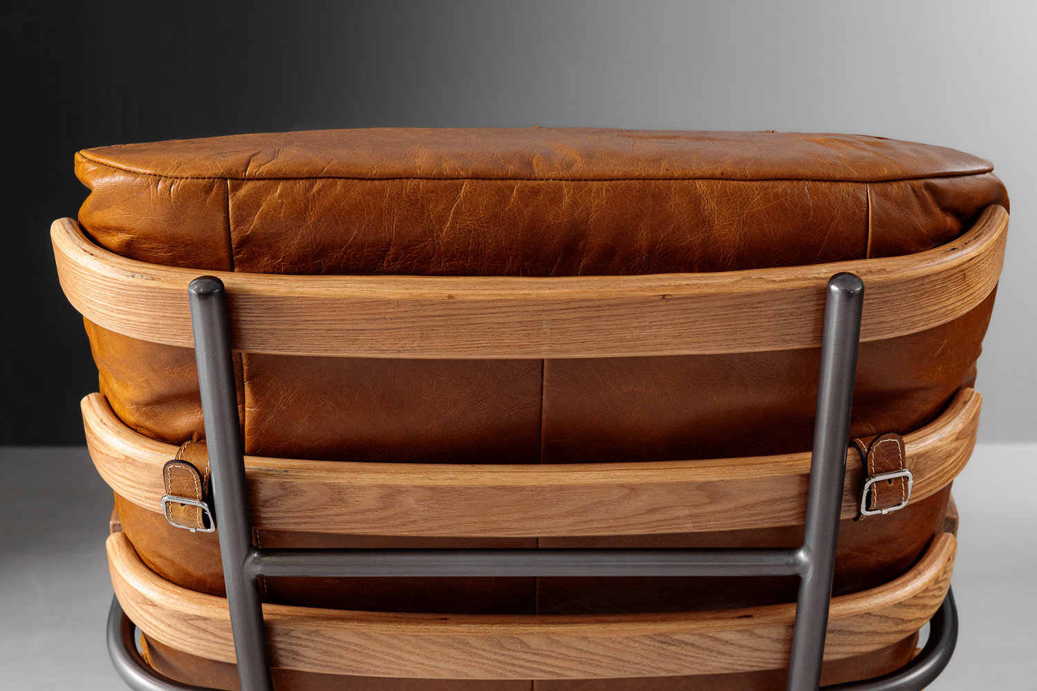 The Fidel Armchair brings the perfect fusion of mid-century elegance and modern craftsmanship to your living room. This iconic chair features rich full grain leather cushions with biscuit tufted detailing, creating a luxurious and comfortable seating experience. Supported by solid mild steel legs and enhanced by oak wood veneers, the Fidel Armchair boasts a timeless silhouette that serves as a statement piece in any space. With bent wood-ripped frame details and buckling strap fixings, this chair combines stylish design with functional beauty, making it a standout addition to contemporary and classic interiors alike.