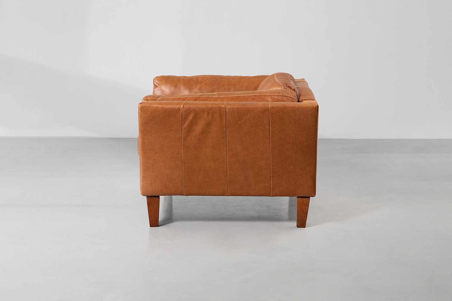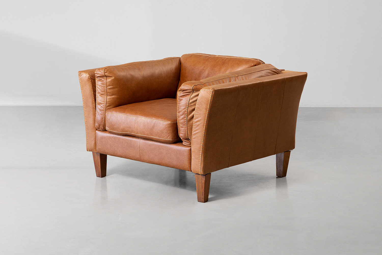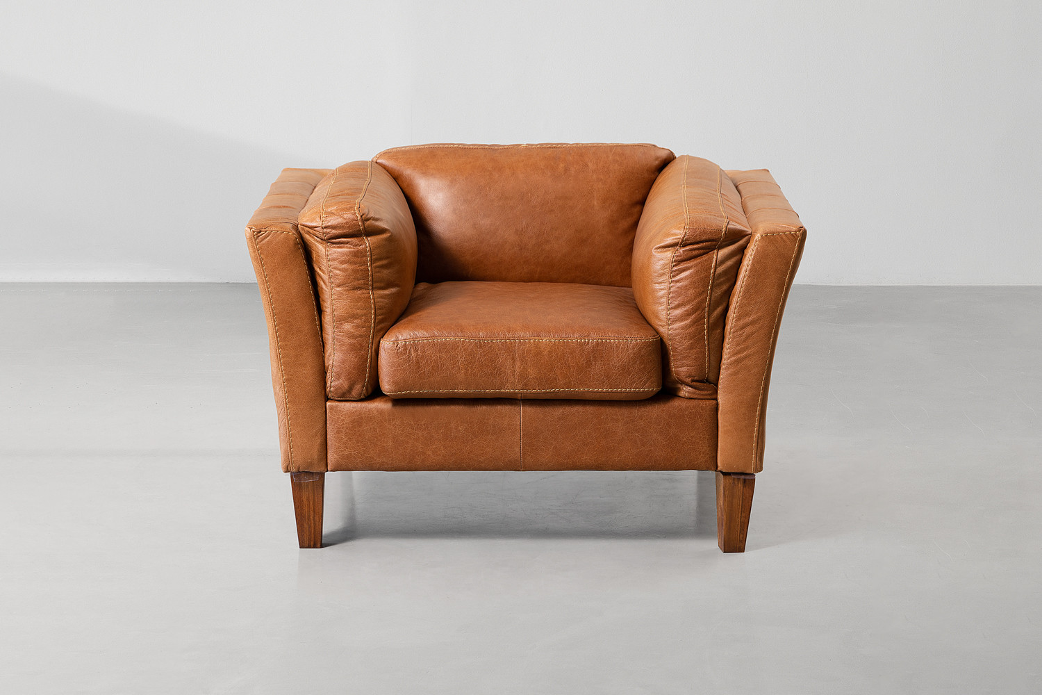 This stylish contemporary armchair boasts plenty of visual and tactile appeal with its distinctive vintage tan full-grain leather and low-slung yet elegant design.