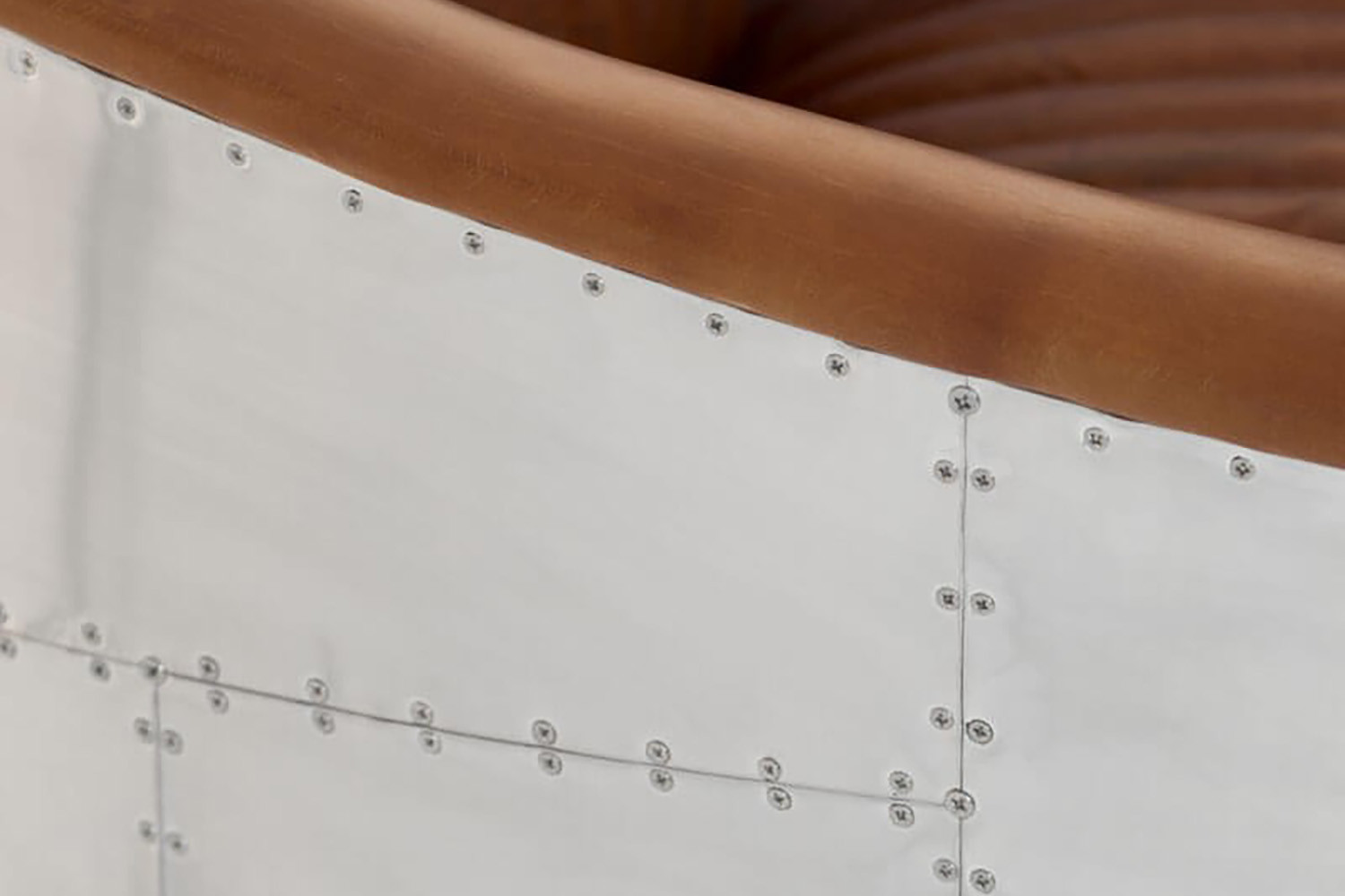 Bold and daring, going where no chair has gone before, the Hawker stands out in any setting. Featuring full-grain leather tailored to perfection, with a distinctive curved frame wrapped in vintage aluminium paneling to replicate a famed WWII fighter plane design, the iconic Hawker Chair makes a statement that simply can’t be ignored.