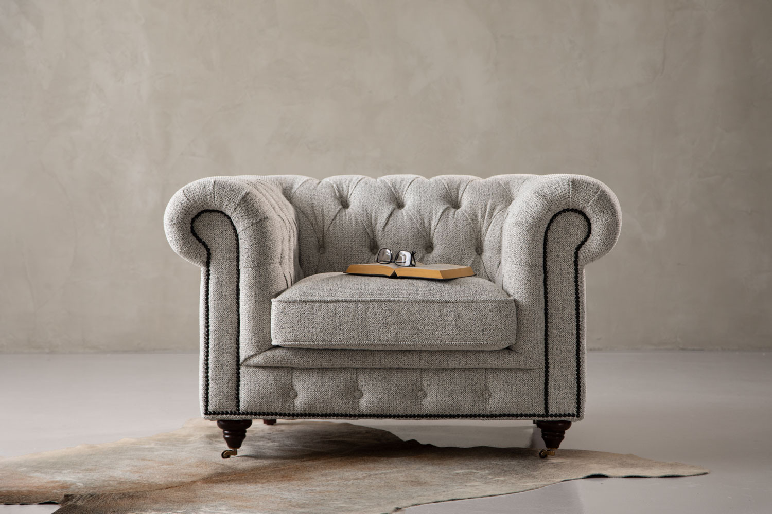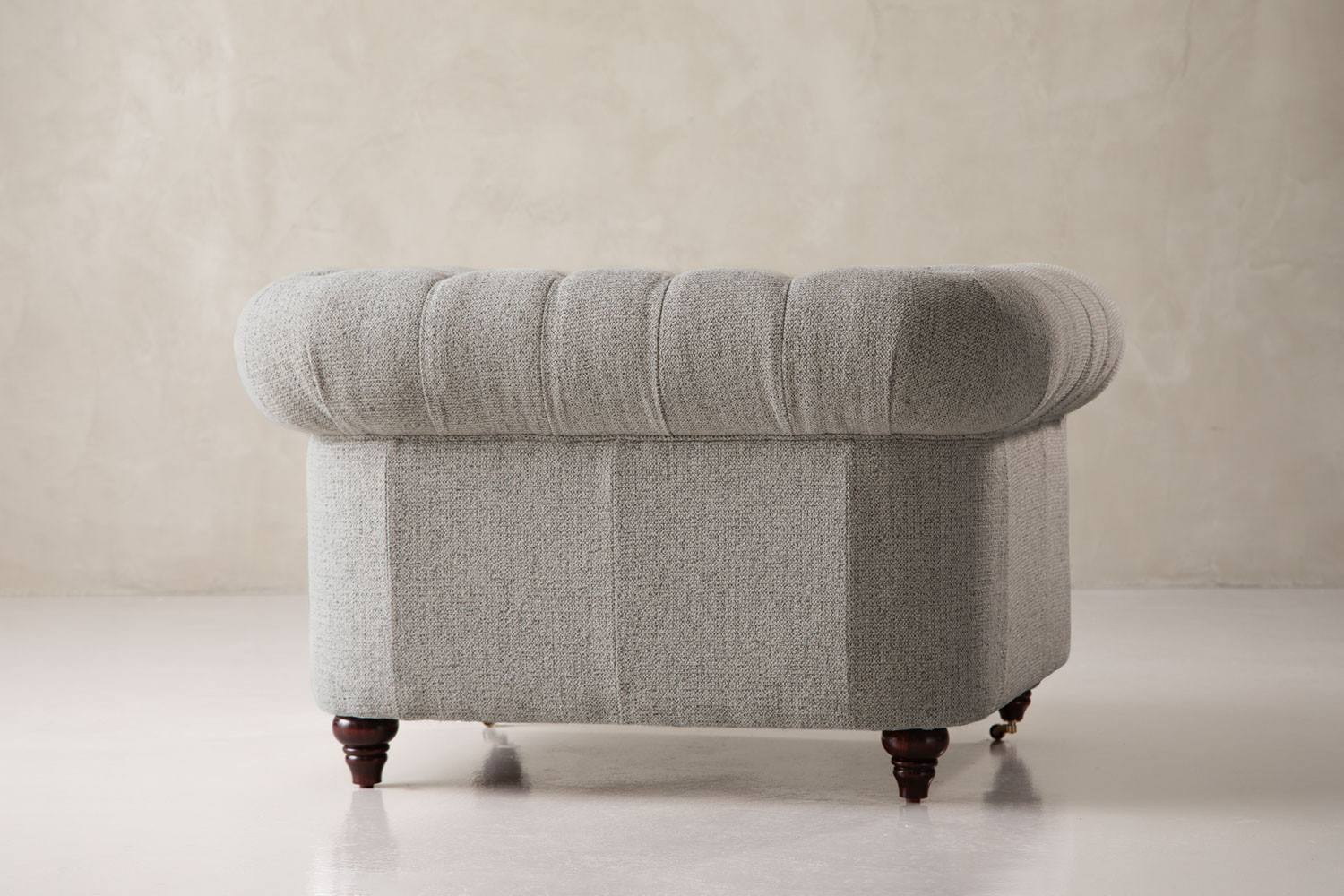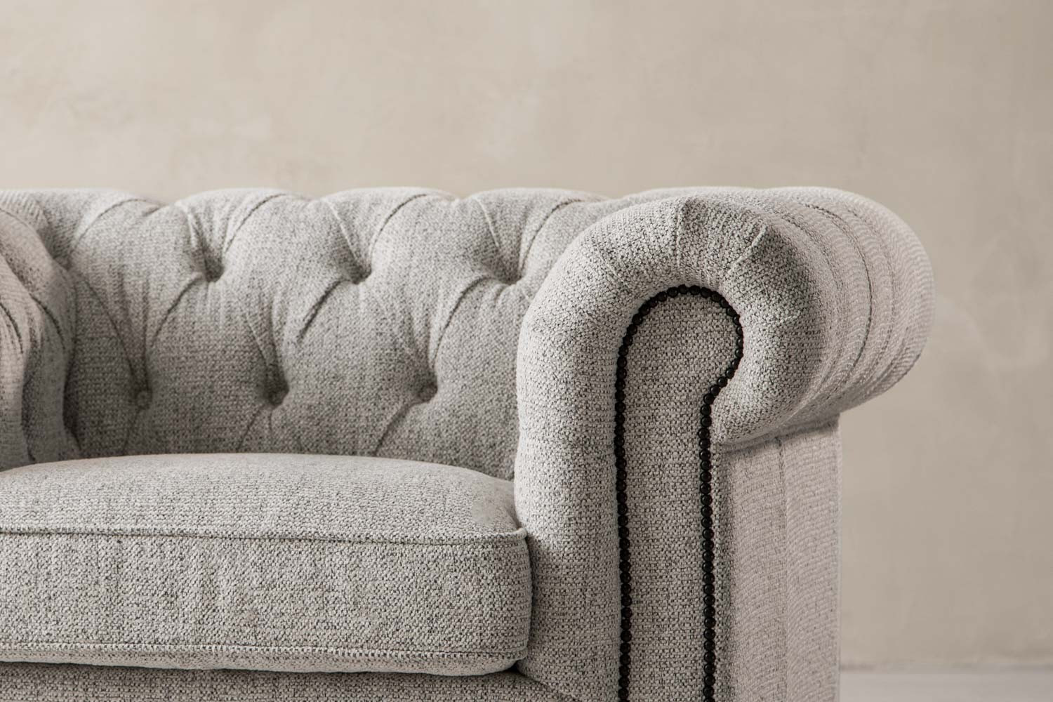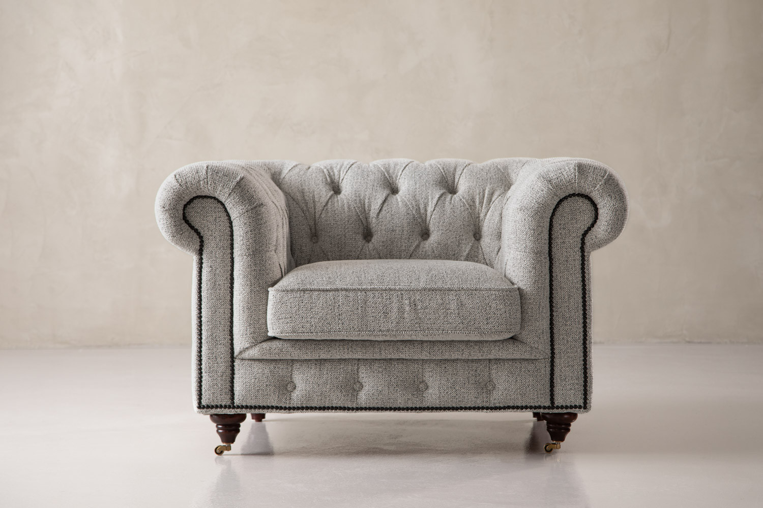The iconic Jefferson Chesterfield Armchair will command any room with effortless charm. With its distinct deep button tufting, high rolled arms and nail head trim, the design has proven itself as a timeless classic over the years. It lives up to its reputation, ensuring the feel of suave luxury with its textured off-white upholstery and piano caster front feet.